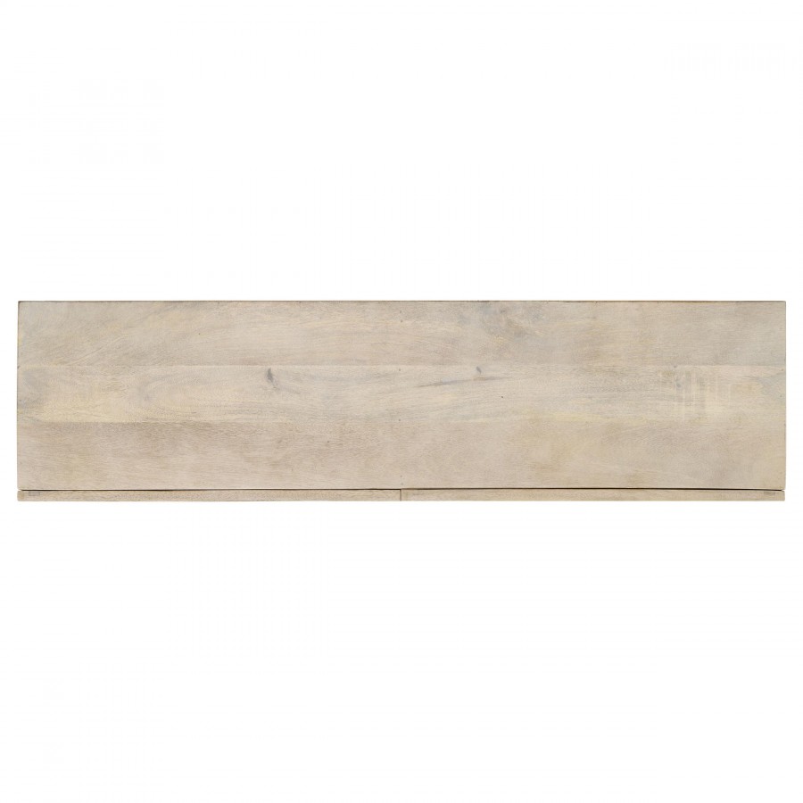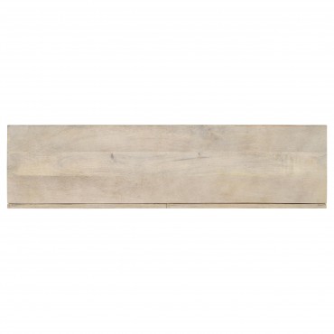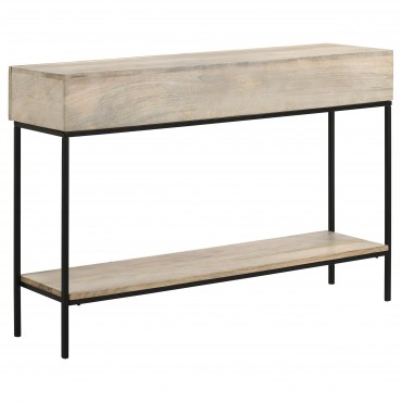Blending modern simplicity with industrial charm, this contemporary console table offers both style and functionality. Crafted from eco-friendly solid mango wood in a whitewashed finish, it features two spacious drawers on smooth wooden glides for concealed storage. The open bottom shelf provides additional space for baskets, décor, or everyday essentials. A slim tubular metal frame in a matte black finish contrasts beautifully with the light wood, creating a sleek silhouette. Perfect for entryways, hallways, or living rooms, this piece delivers a refined and versatile aesthetic.