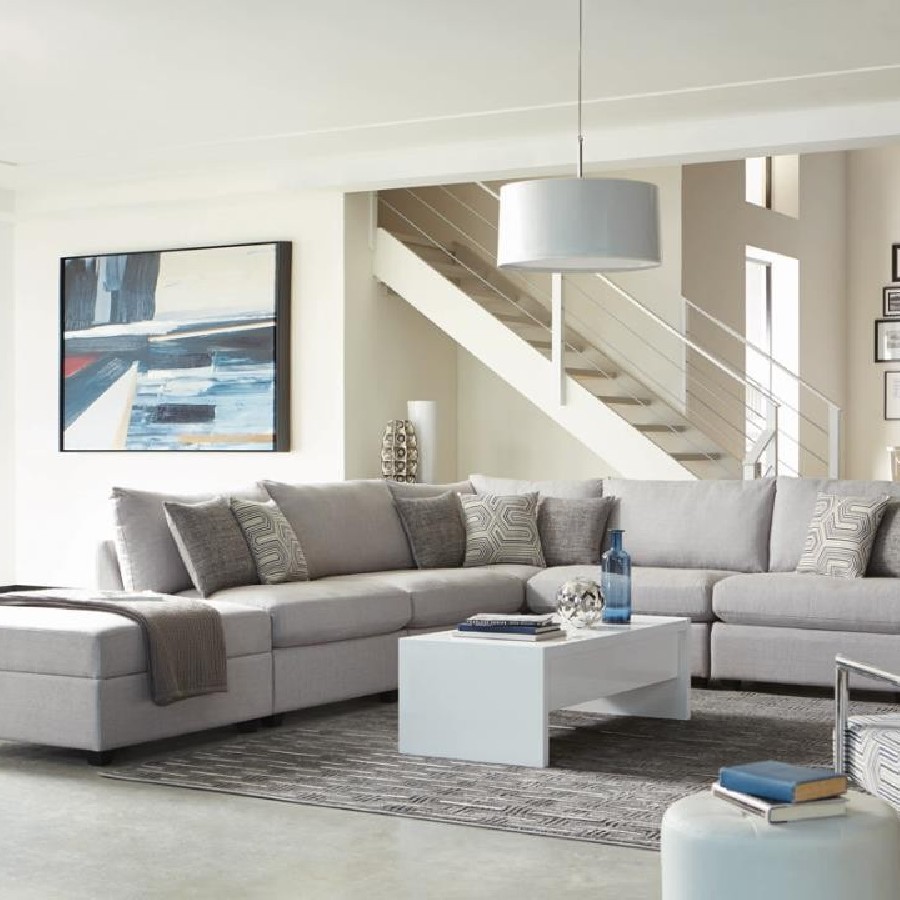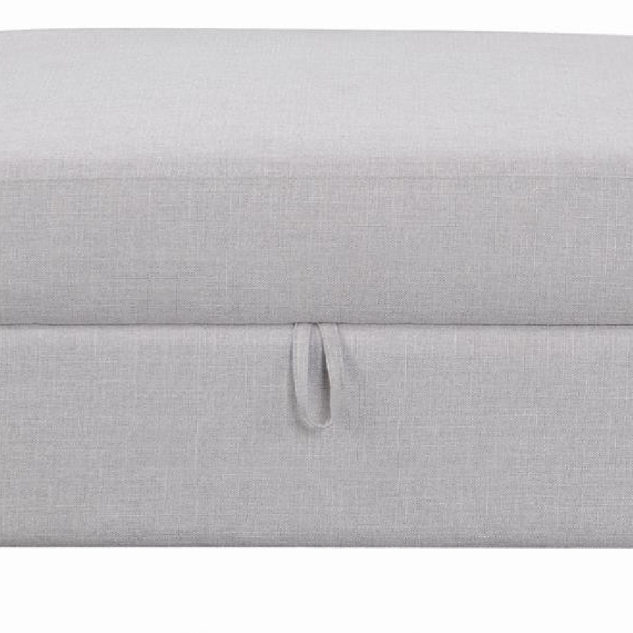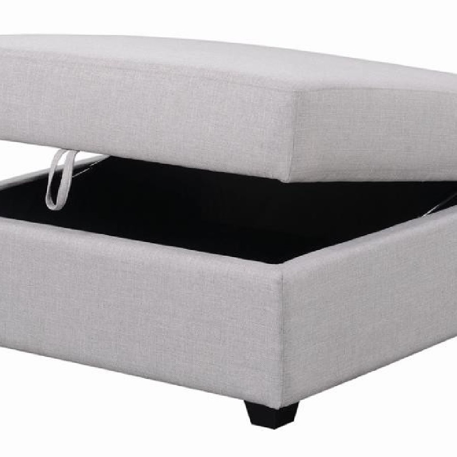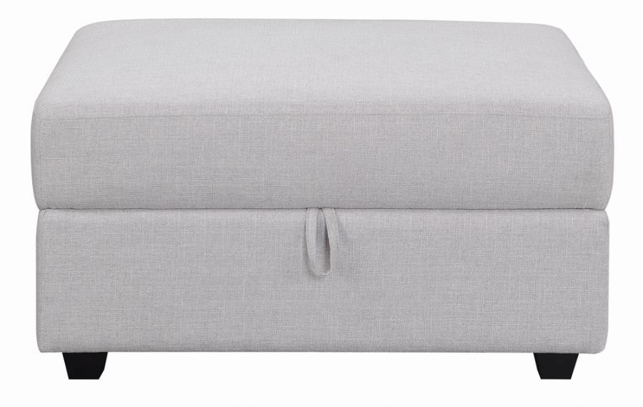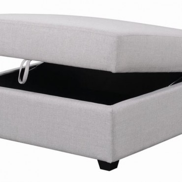 This storage ottoman combines sleek modern design with functional versatility for the living room. Upholstered in soft grey fabric, it features clean lines and a spacious hidden compartment for storing blankets, pillows, or daily essentials. Designed to pair seamlessly with modular sectional components or stand alone as a plush footrest, it offers exceptional flexibility. Feather-down wrapped cushioning and solid wood legs provide lasting comfort and support, blending practicality with refined contemporary style.