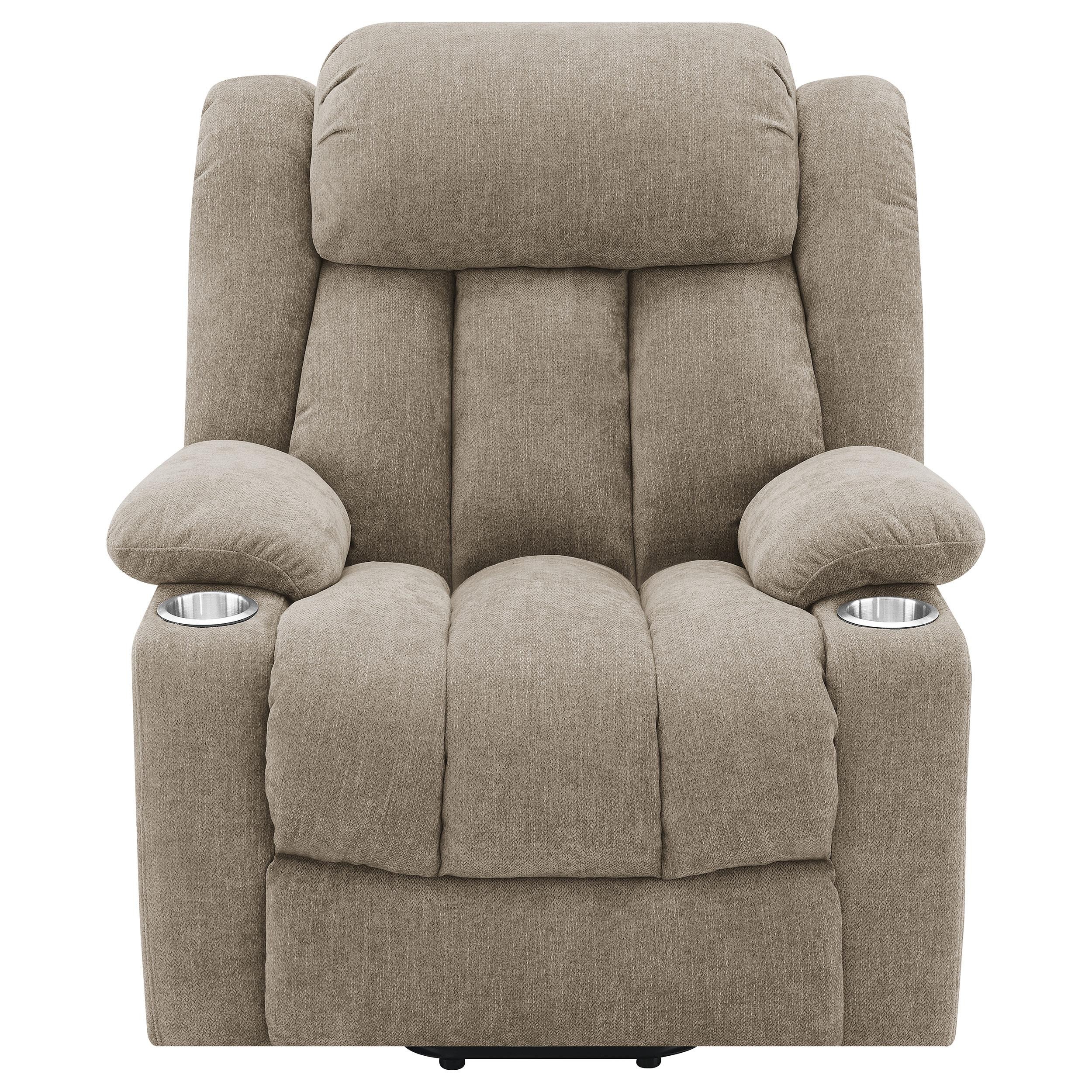Deliver exceptional comfort and convenience with a modern power lift recliner that allows you to kick back and relax while also assisting you in getting back on your feet. Its plush, overstuffed look is inviting in a living room or den, while contour tufting creates exceptional support for your whole body. The recliner is operated with a power panel that includes simple buttons and a built-in USB port for easy access. The power panel is on the right side when seating and is paired with a soft pocket, perfect for tucking reading materials or a puzzle book. Soft upholstery, pillowtop arms and two cupholders add to the inviting look and feel of this charming recliner.