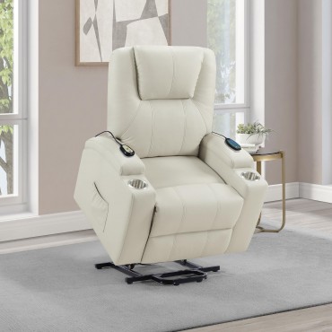 This power lift recliner delivers premium comfort and functionality, perfect for relaxing in style. The chair features luxurious faux leather upholstery and an ergonomic design to support your body at every angle. The power lift mechanism ensures easy movement in and out of the chair, offering assistance for standing or sitting with minimal effort. With integrated cup holders and side storage pockets, convenience is at your fingertips. The chair also includes massage and heat functions, allowing you to unwind and soothe your muscles after a long day. The wired remote control provides effortless operation of all features, from reclining to massage intensity.