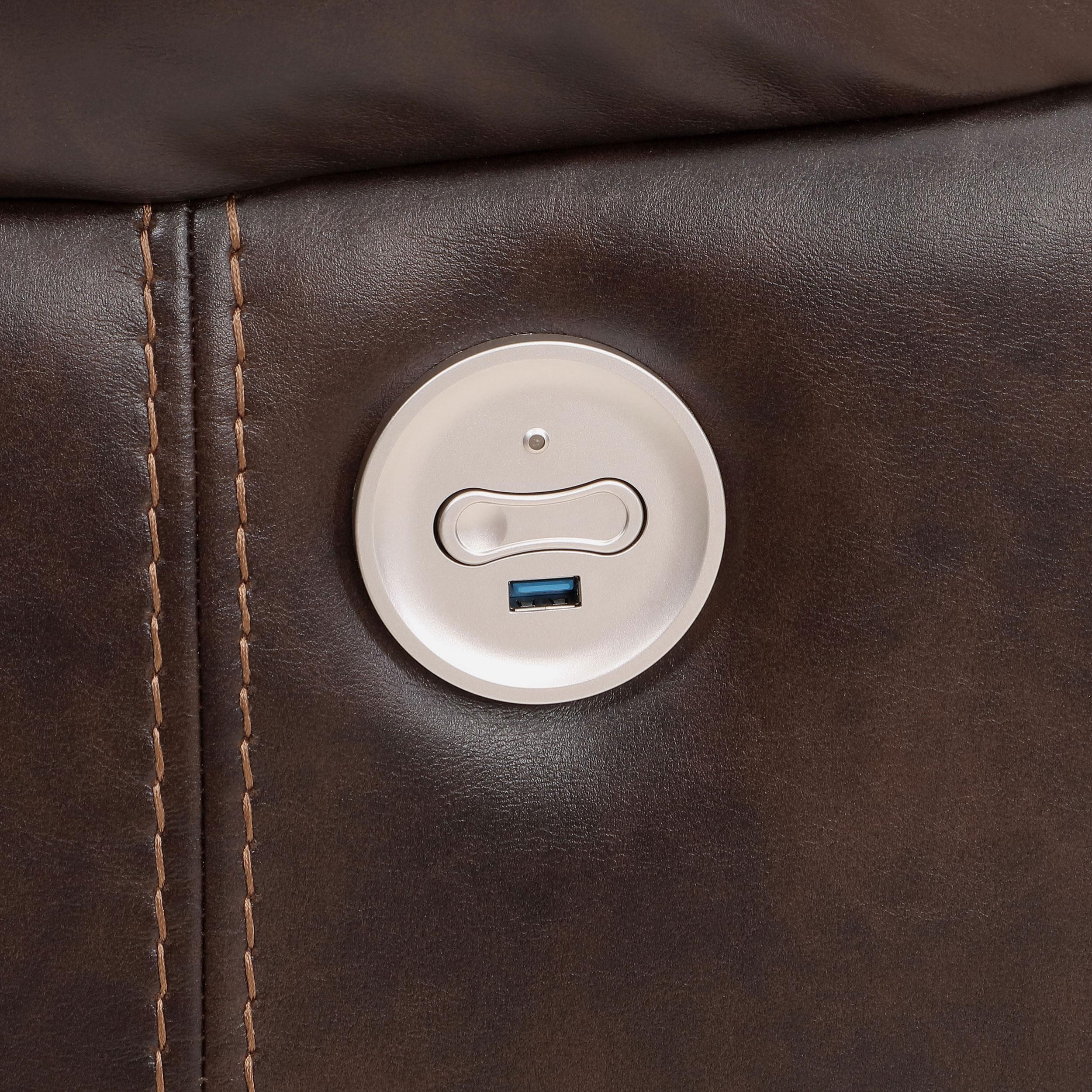 Take relaxation to the next level with a modern power recliner. Smooth, stylish faux leather upholstery sets the tone with accent stitching that creates texture and depth perfect for your living room or den. Plush cushions cradle you in comfort, while contour tufting delivers impressive support. Its dark coloration blends in varied settings, from modern casual living rooms to cozy, classic dens. its control panel includes a built in USB port, perfect for keeping your phone charged while you kick up your feet and relax.