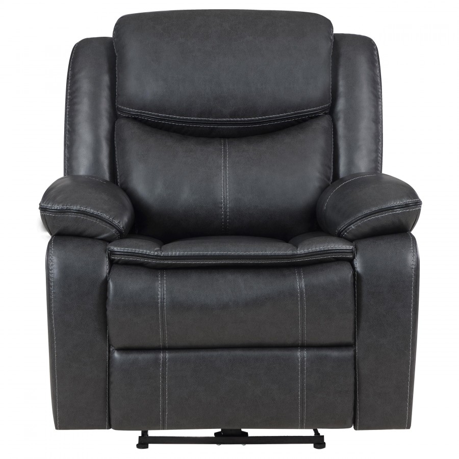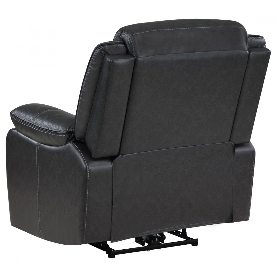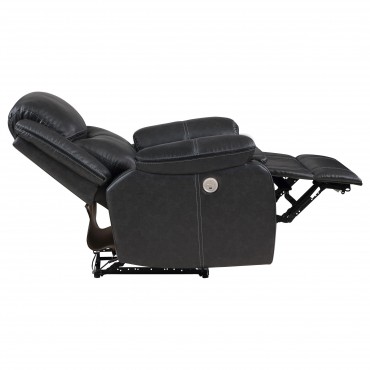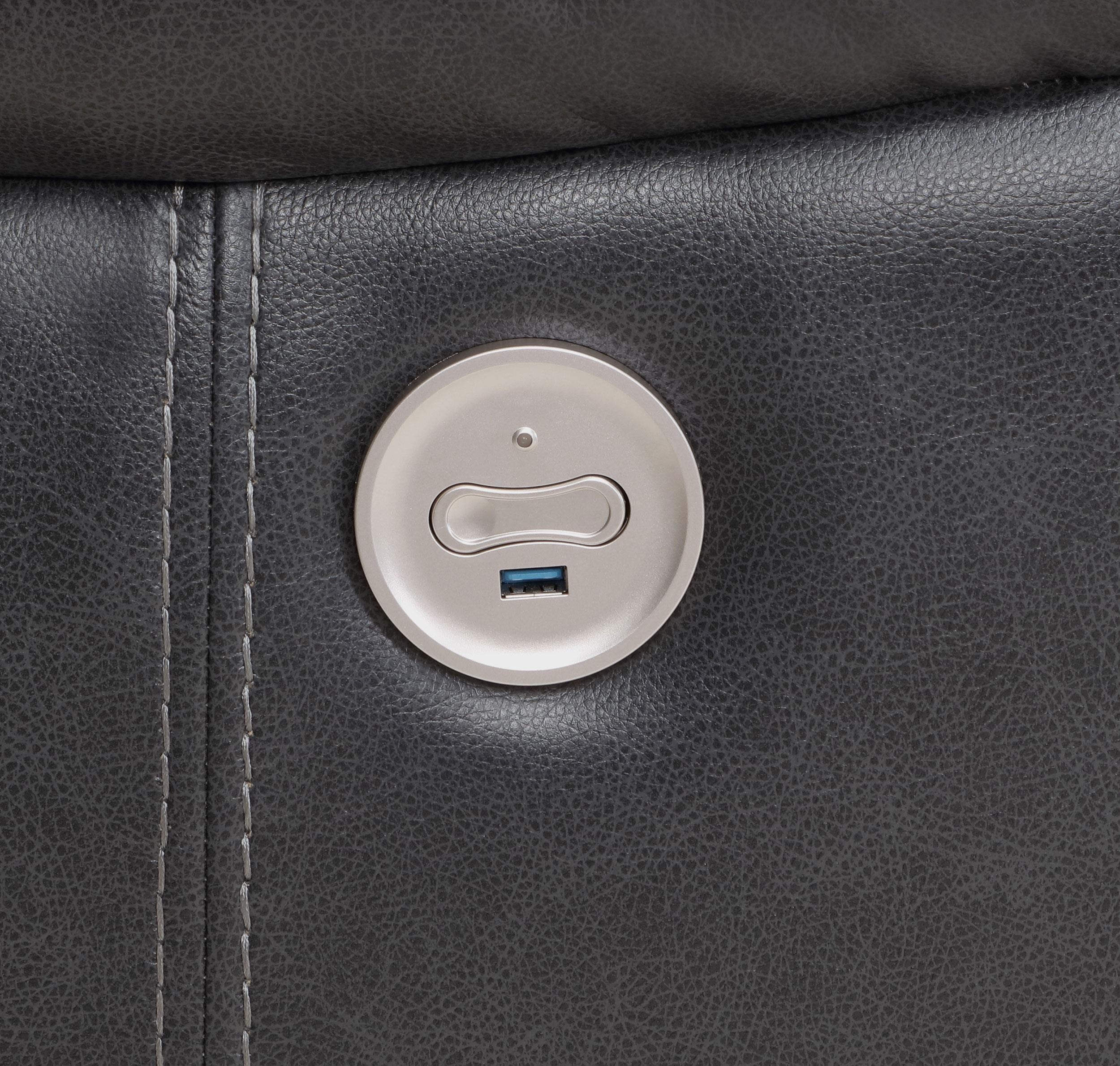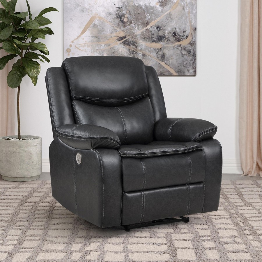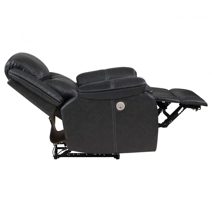 Take relaxation to the next level with a modern power recliner. Smooth, stylish faux leather upholstery sets the tone with accent stitching that creates texture and depth perfect for your living room or den. Plush cushions cradle you in comfort, while contour tufting delivers impressive support. Its dark coloration blends in varied settings, from modern casual living rooms to cozy, classic dens. its control panel includes a built in USB port, perfect for keeping your phone charged while you kick up your feet and relax.