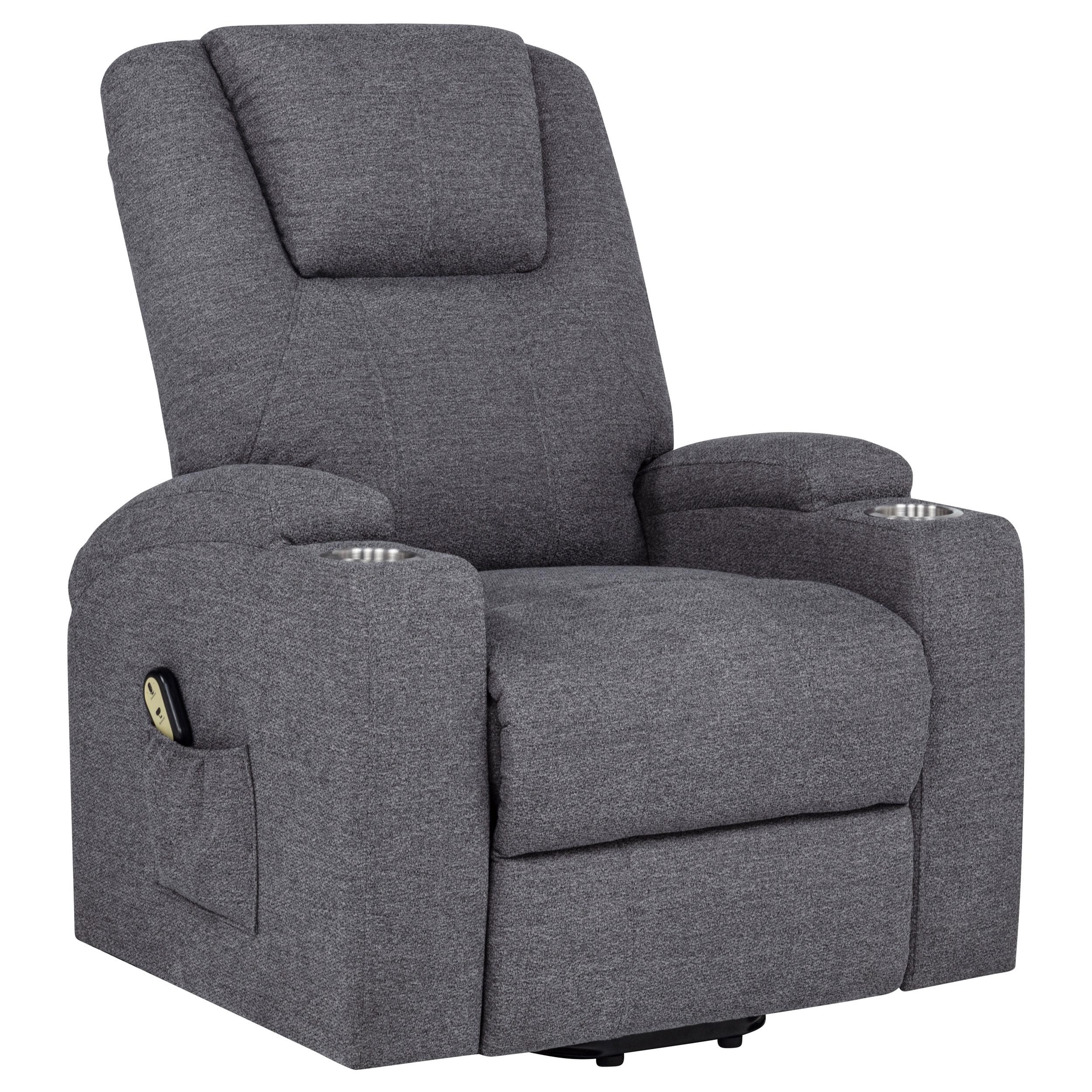 Gracefully merging comfort, function, and care, this power lift massage chair offers a luxurious retreat at the touch of a button. Wrapped in soft chenille, its plush silhouette supports you with gentle recline, heated massage, and a smooth lift mechanism—perfect for easing into or out of relaxation. Dual stainless steel cup holders and side storage pockets provide thoughtful utility, making it a serene and supportive haven for everyday unwinding.