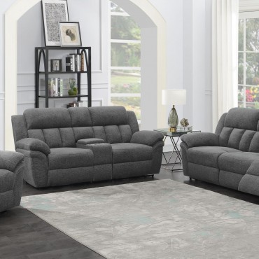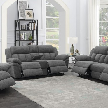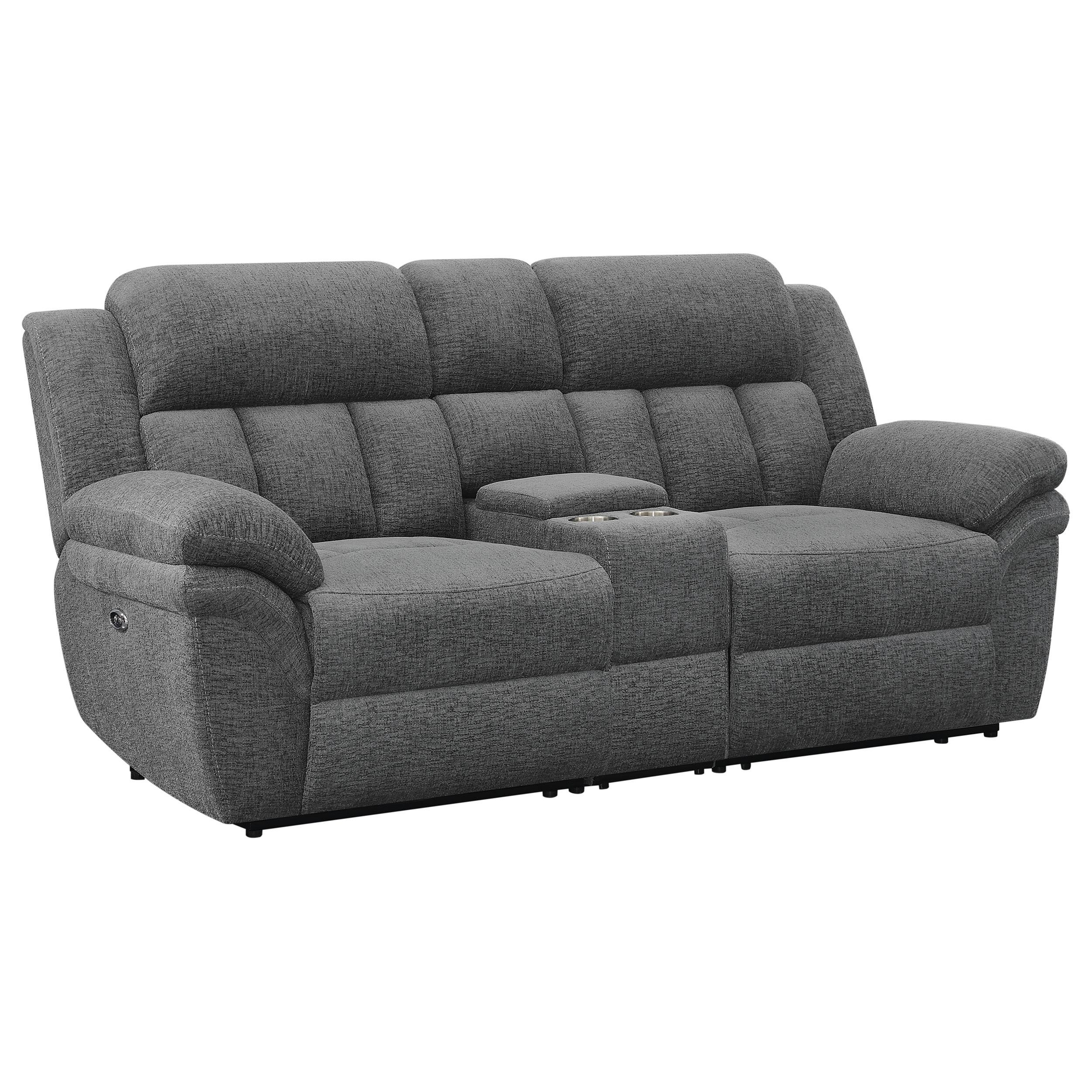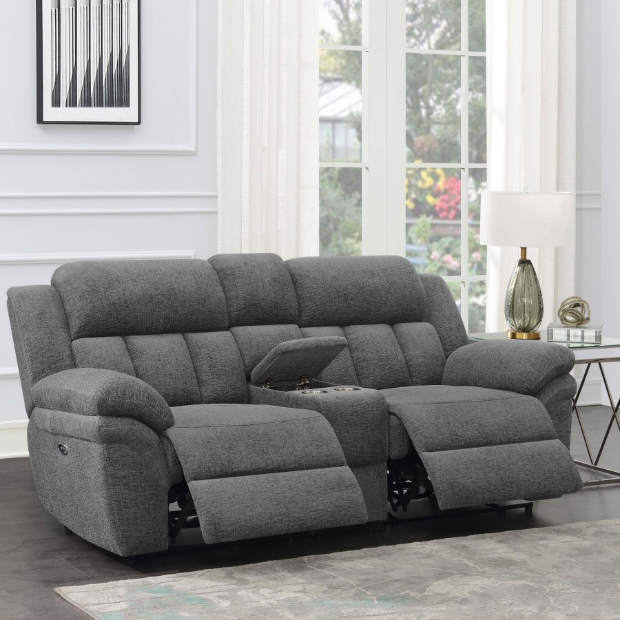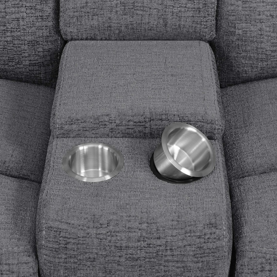 Settle down with a great book or kick up your feet watching your favorite team in the indulgent comfort of a transitional power reclining loveseat. Dual recliners are divided with a storage console, offering a spot to stash remotes and other essentials, and a pair of cupholders for beverages. Soft charcoal upholstery offers a neutral color palette to coordinate with surrounding decor, and offers inviting style. Extra-plush cushions and pillowtop arms bring inviting, indulgent comfort, perfect for a relaxing family room. Power recline mechanisms are operated with the touch of a button, ensuring smooth, seamless performance.