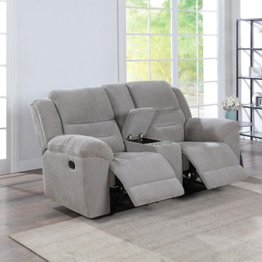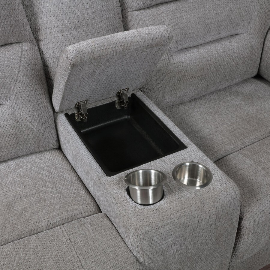 Experience superior comfort and functionality with this manual reclining loveseat. Upholstered in soft grey chenille, it combines cozy texture with supportive cushioning. The center console includes a soft-close compartment and removable stainless steel cup holders, keeping essentials within reach. Pillow top armrests and padded backs offer enhanced comfort for lounging. Perfect for movie nights or everyday relaxation, this loveseat balances luxury and practicality with effortless charm.