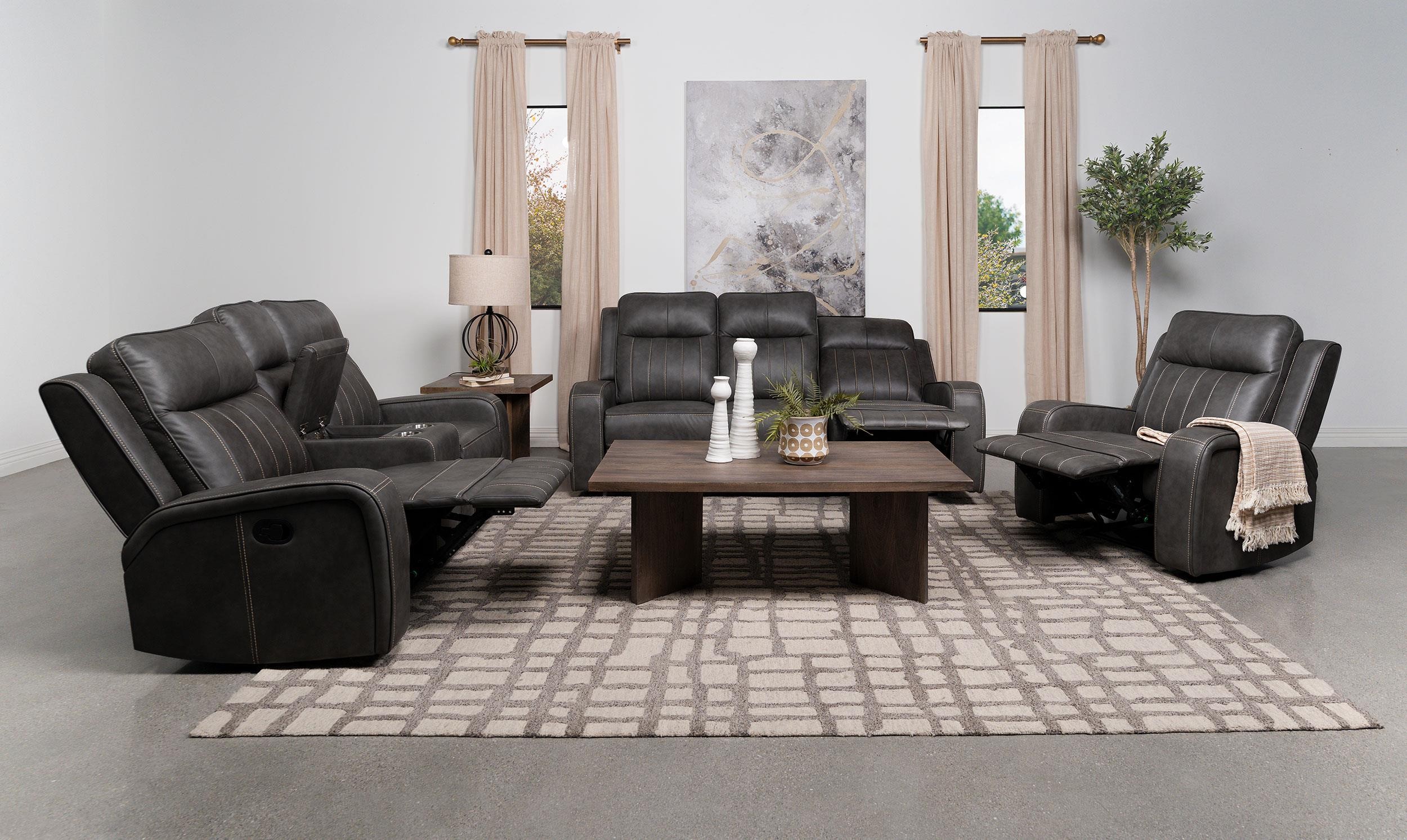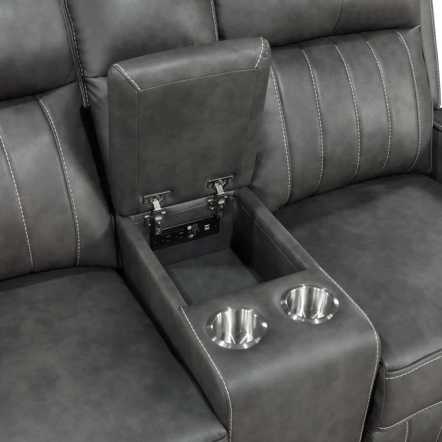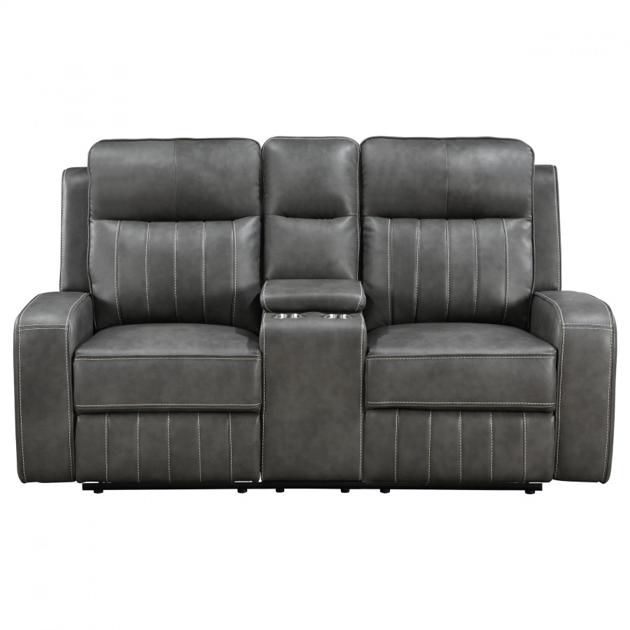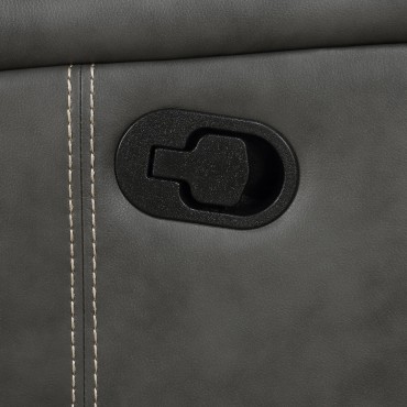 Blending modern and transitional design, this motion loveseat delivers both style and comfort. Upholstered in smooth grey leatherette, it features decorative vertical topstitching for visual dimension. Plush foam padding and pocket coil spring cushions provide supportive comfort, while ultra-padded headrests enhance relaxation. A wall-hugger reclining mechanism saves space, and a flip-top center console offers storage for remotes and essentials. Two built-in cup holders keep beverages within reach, making this loveseat perfect for everyday lounging.
