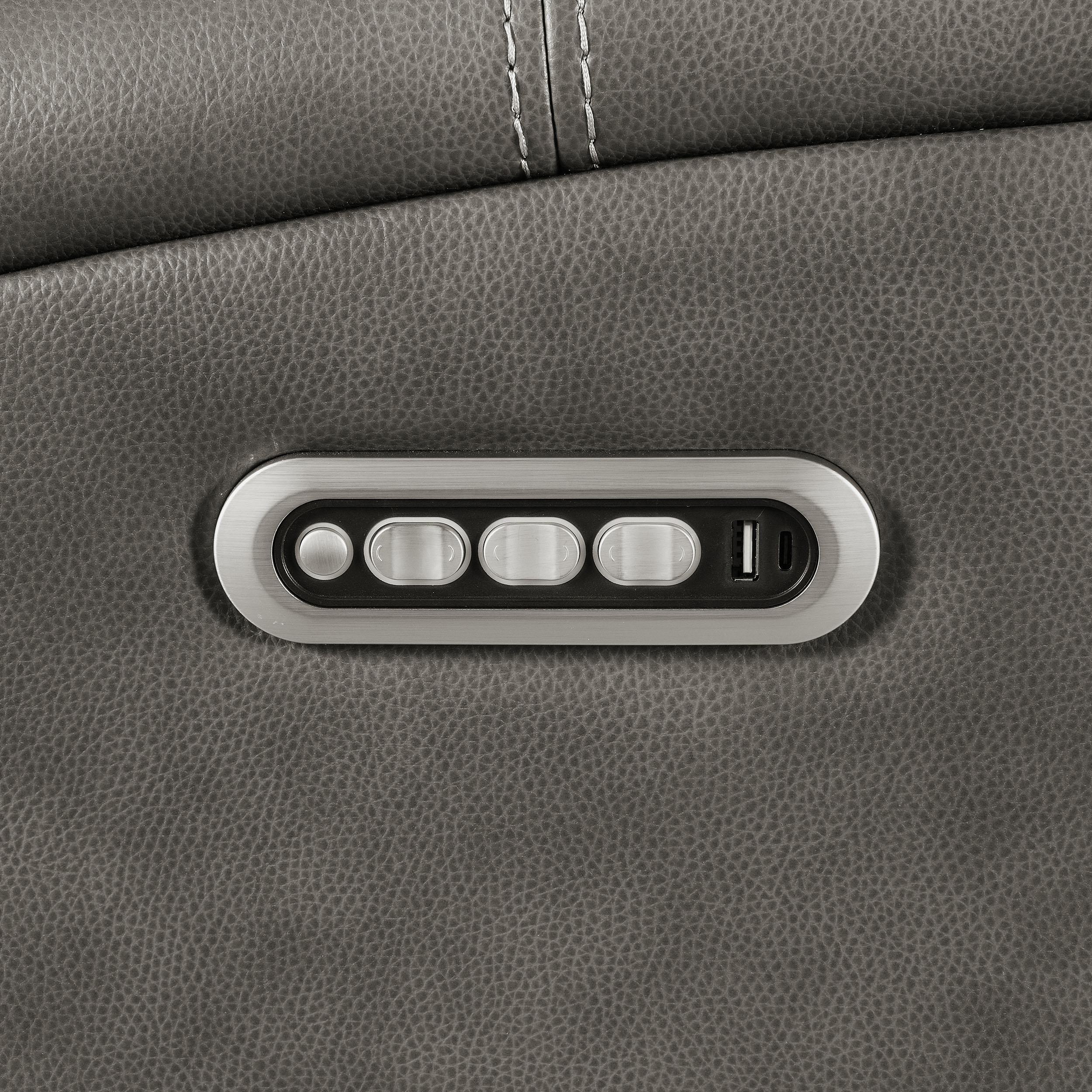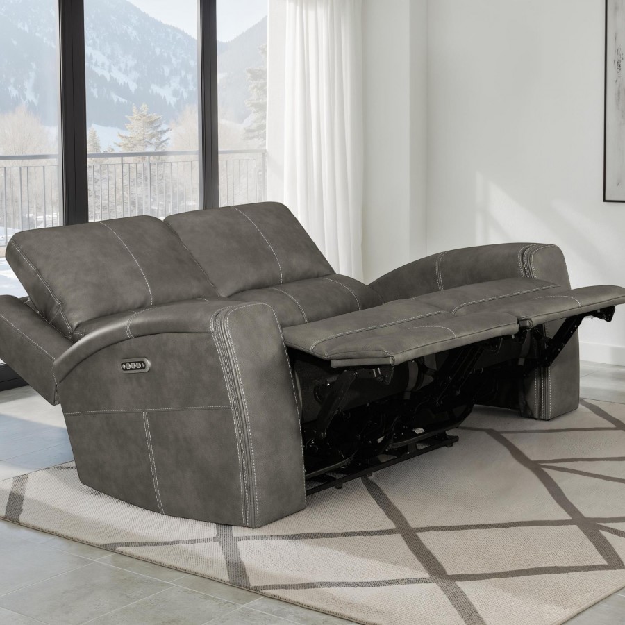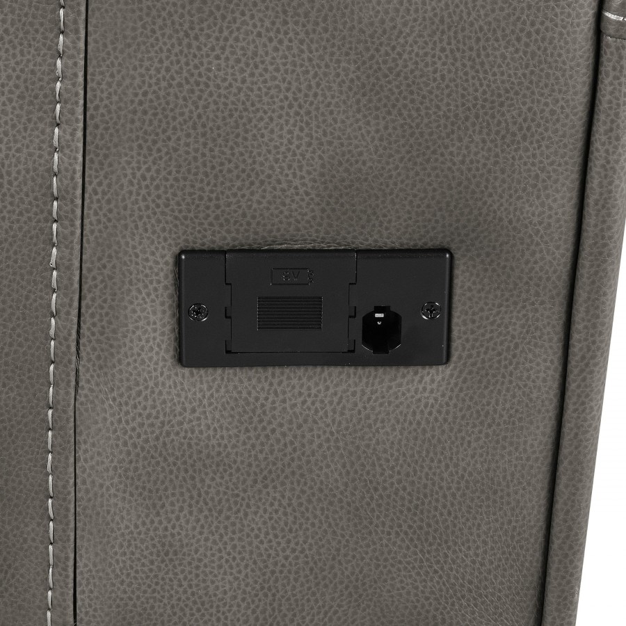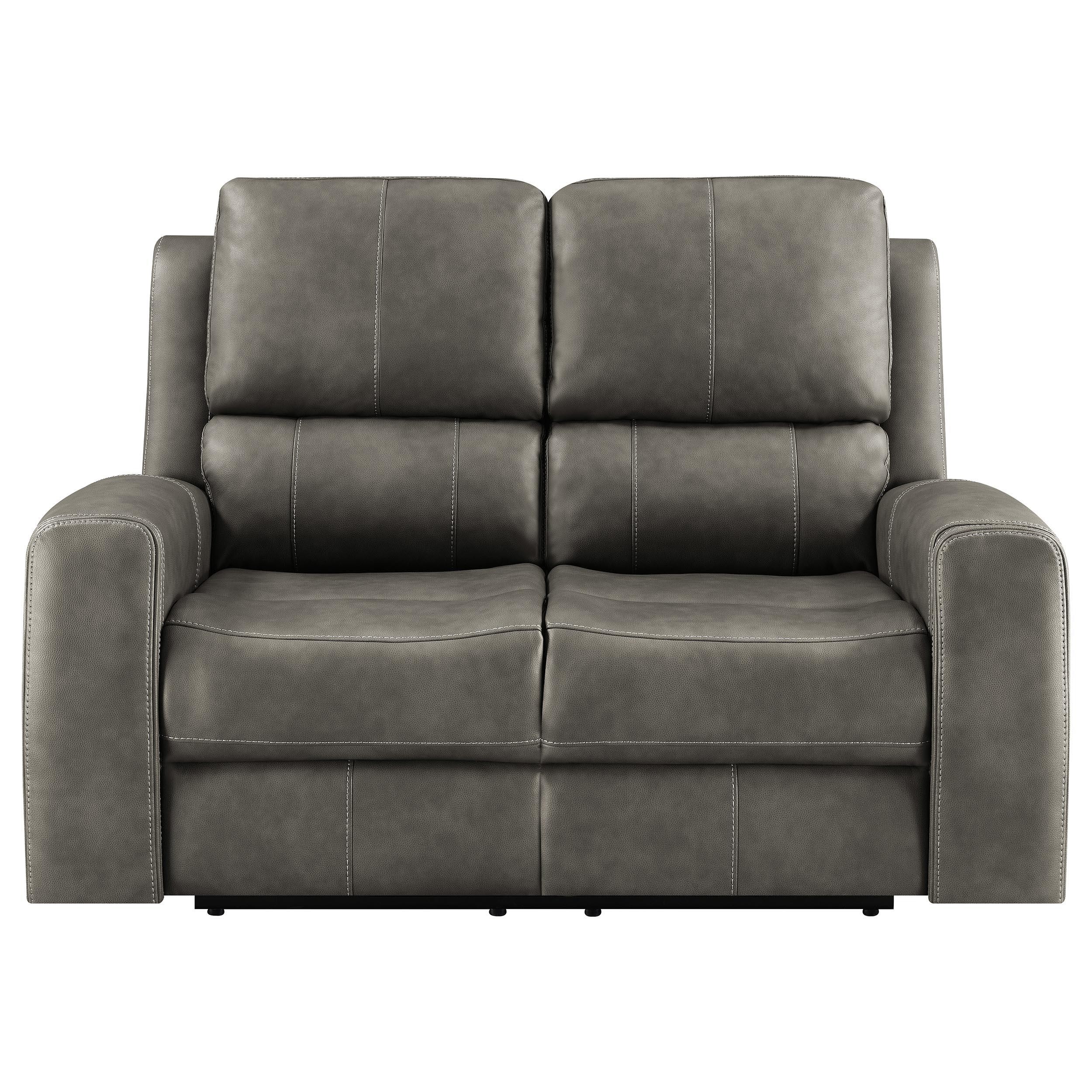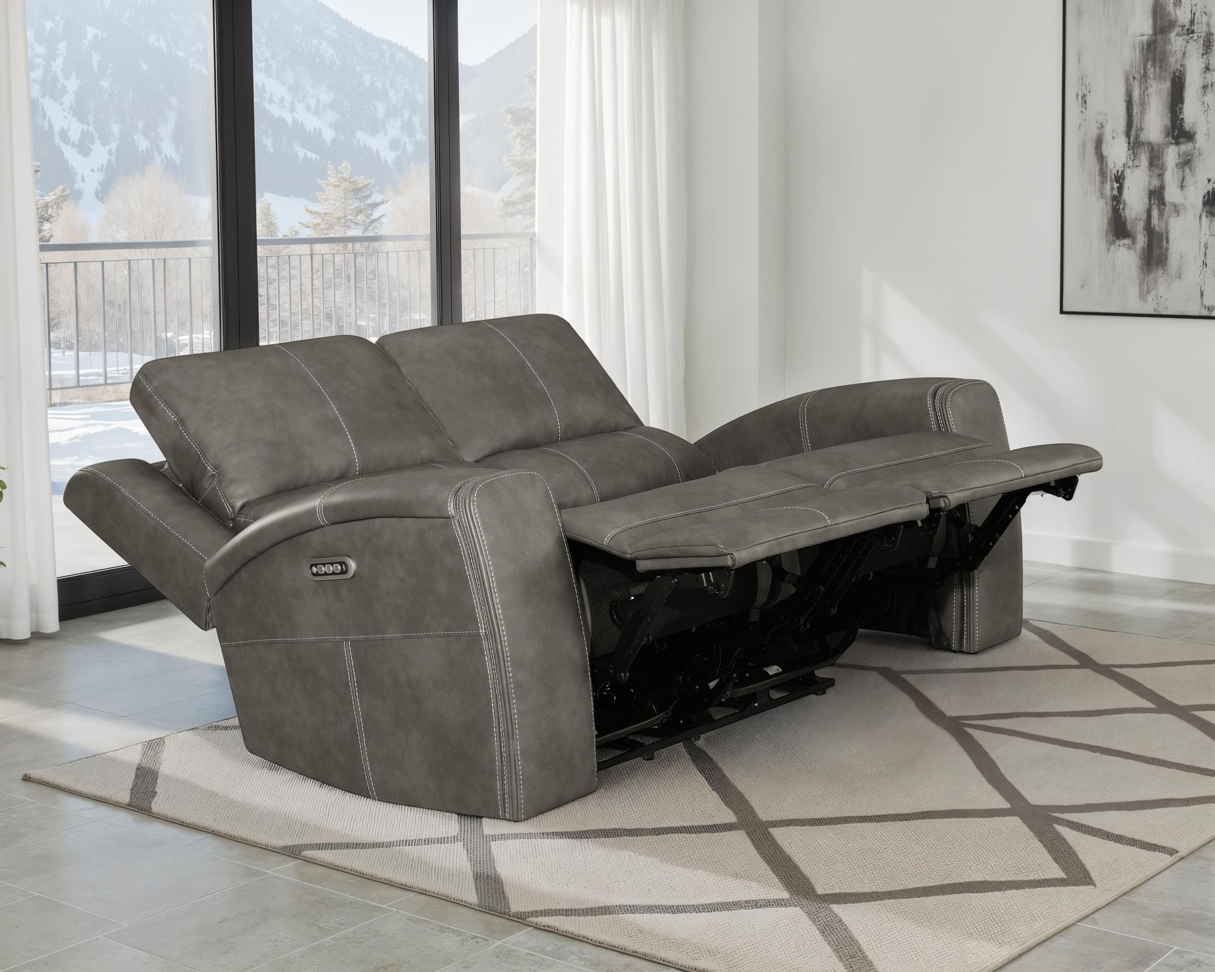 Designed to embrace your every mood, this triple power reclining loveseat transforms quiet evenings into indulgent escapes. Rich leatherette envelopes sculpted cushions, tailored with striking contrast stitching for a refined, modern aesthetic. Effortlessly adjust the power recline, headrest, and lumbar support with an integrated control panel, complete with dual USB ports to keep your devices powered and close. Thoughtfully placed armrest cup holders elevate your lounging experience, while a rear AC access port with emergency battery option ensures seamless operation, no matter the moment.
