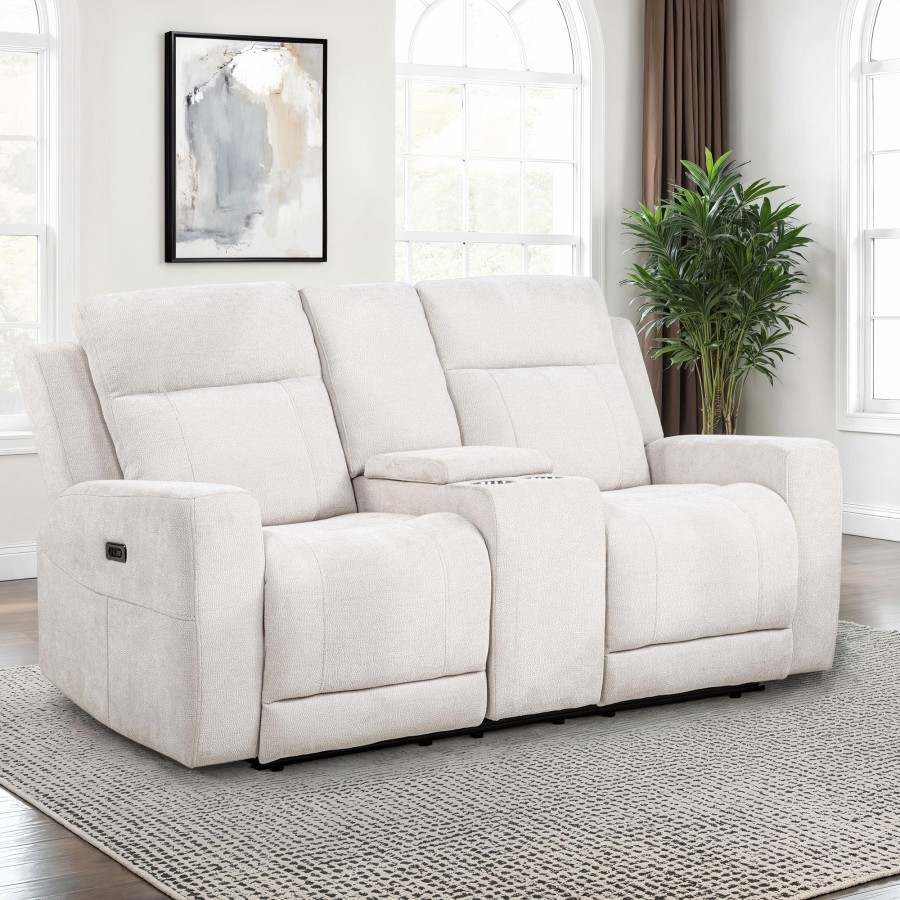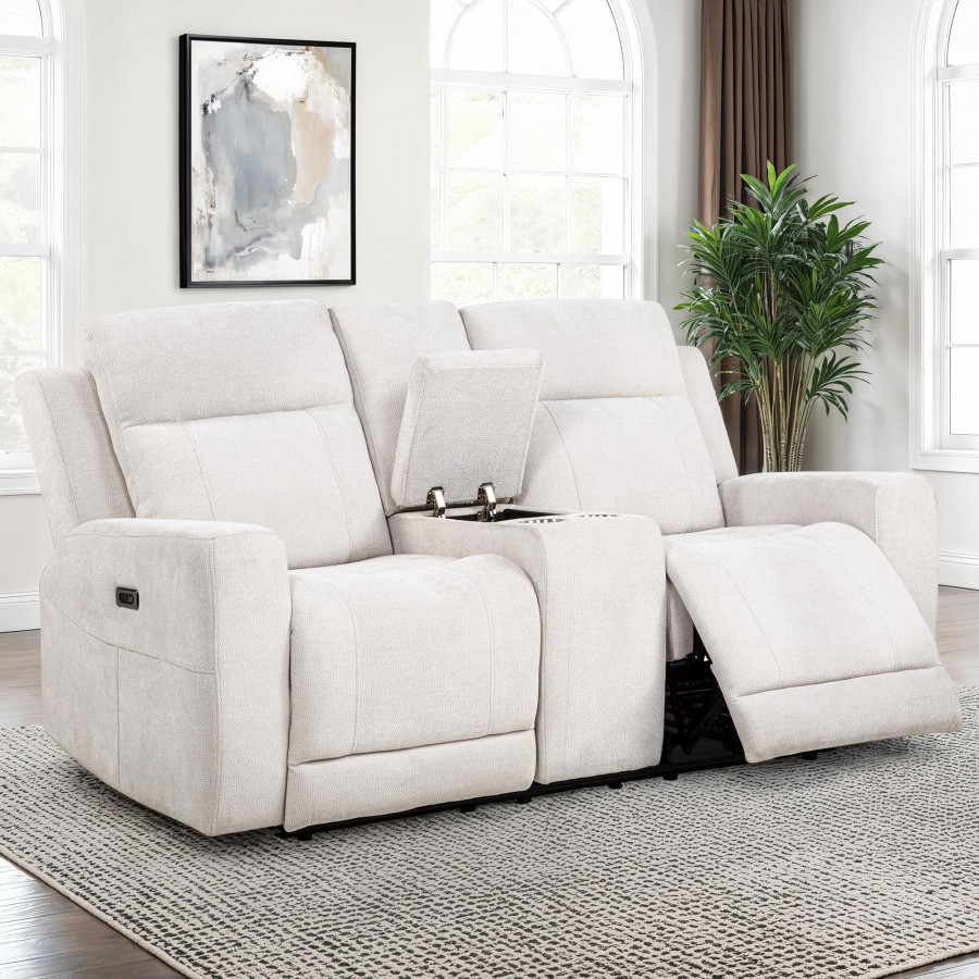 Unwind in perfect sync with this chenille power reclining loveseat, crafted for shared comfort and convenience. Dual recliners offer smooth, quiet motion at your touch, while a center console adds thoughtful storage with a lift-top compartment and two removable stainless steel cup holders. Wrapped in soft, textured chenille and reinforced with a durable metal frame, this piece blends everyday luxury with functional ease.