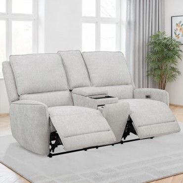 This reclining loveseat captures the essence of cozy sophistication, designed for shared moments and quiet indulgence. Outfitted in plush dove grey chenille, its smooth, sculpted form invites relaxation at the push of a button. Dual power recliners extend effortlessly, controlled by integrated side buttons, while a center console with hidden storage and cup holders adds functional ease. Built atop a sturdy wood and metal frame, it offers enduring comfort for two.