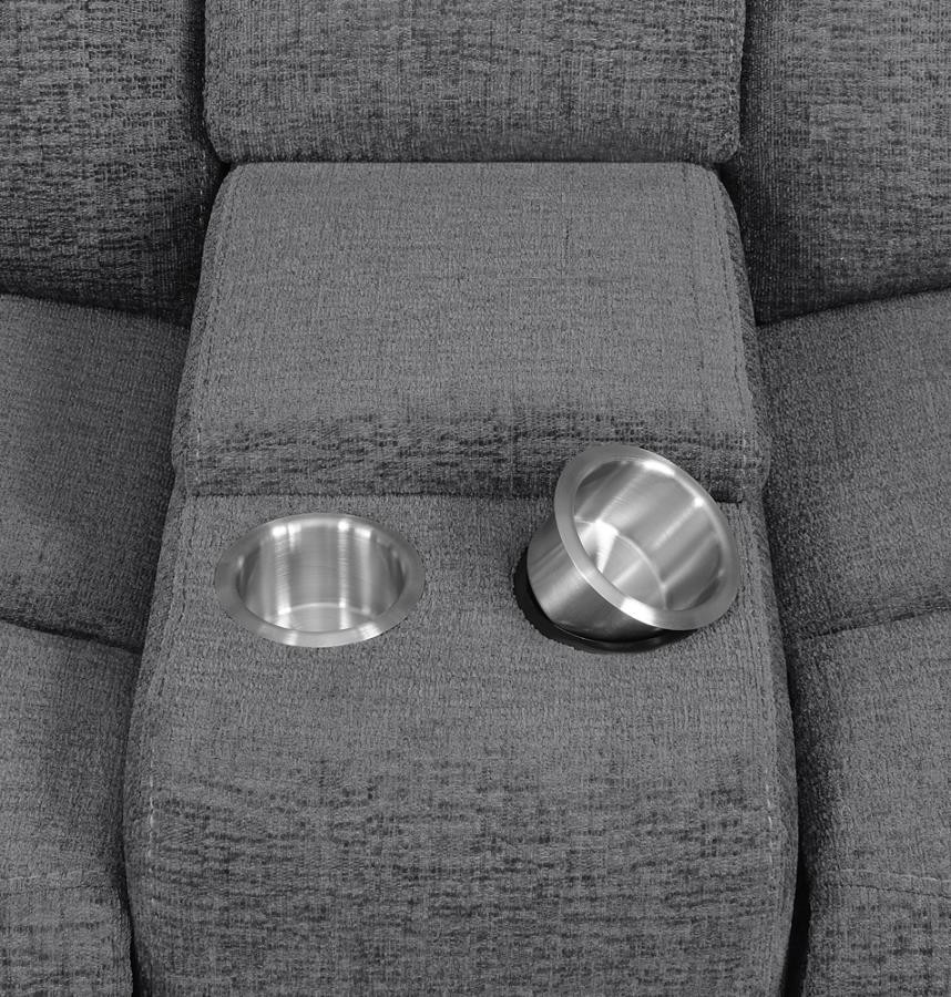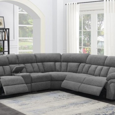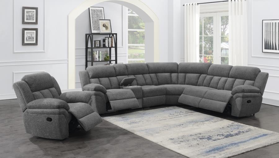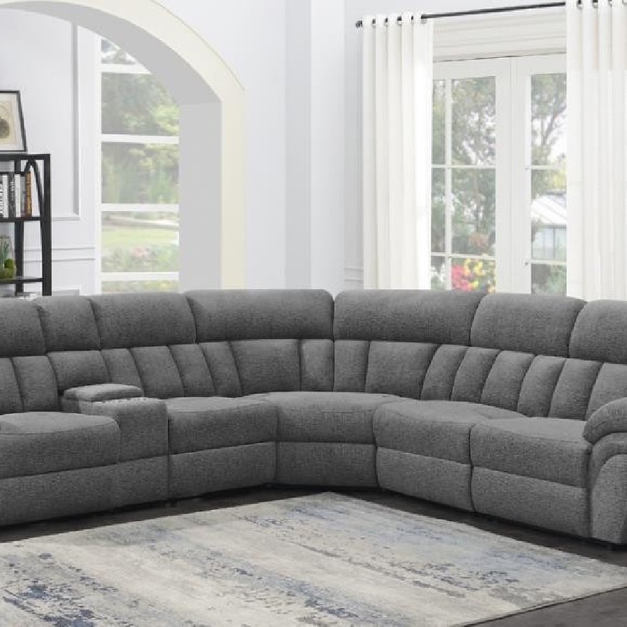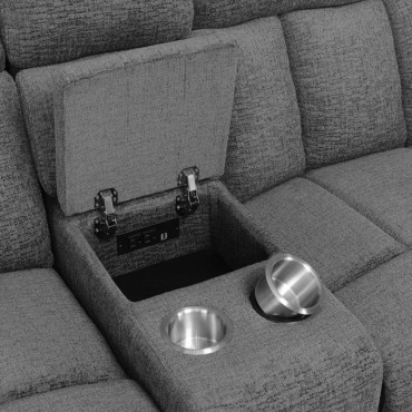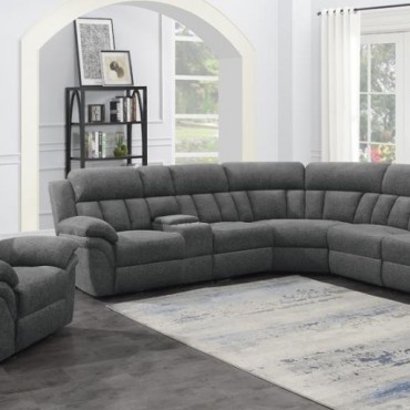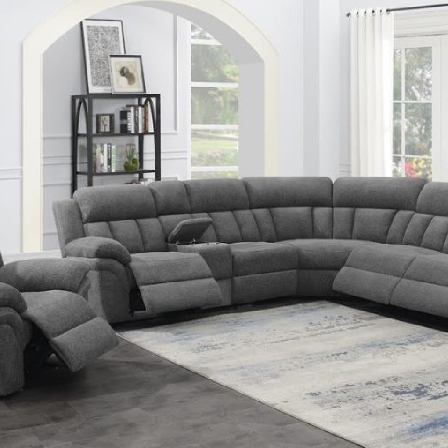Bring comfort and convenience into your home with this six-piece modular manual sectional. Wrapped in charcoal performance chenille, it features three wall-hugging recliners that maximize space while offering cozy relaxation. A lift-top console provides storage for essentials and two stainless steel cup holders with removable inserts. Designed with supportive pocket coil seating and topped with cool gel memory foam, this sectional combines everyday durability with lasting comfort for family living or entertainment rooms.