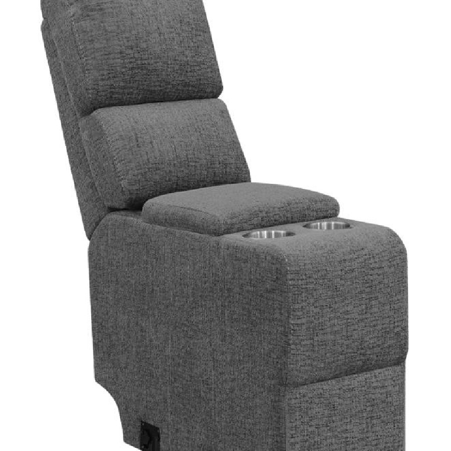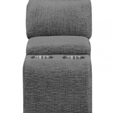 Designed to enhance convenience, this console unit seamlessly integrates into the modular sectional for added functionality. Upholstered in charcoal fabric, it features a lift-top storage compartment to keep essentials within reach. Two built-in cupholders with stainless steel inserts provide a secure spot for beverages, ensuring a comfortable lounging experience. Its padded design blends seamlessly with the sectional for a cohesive look.