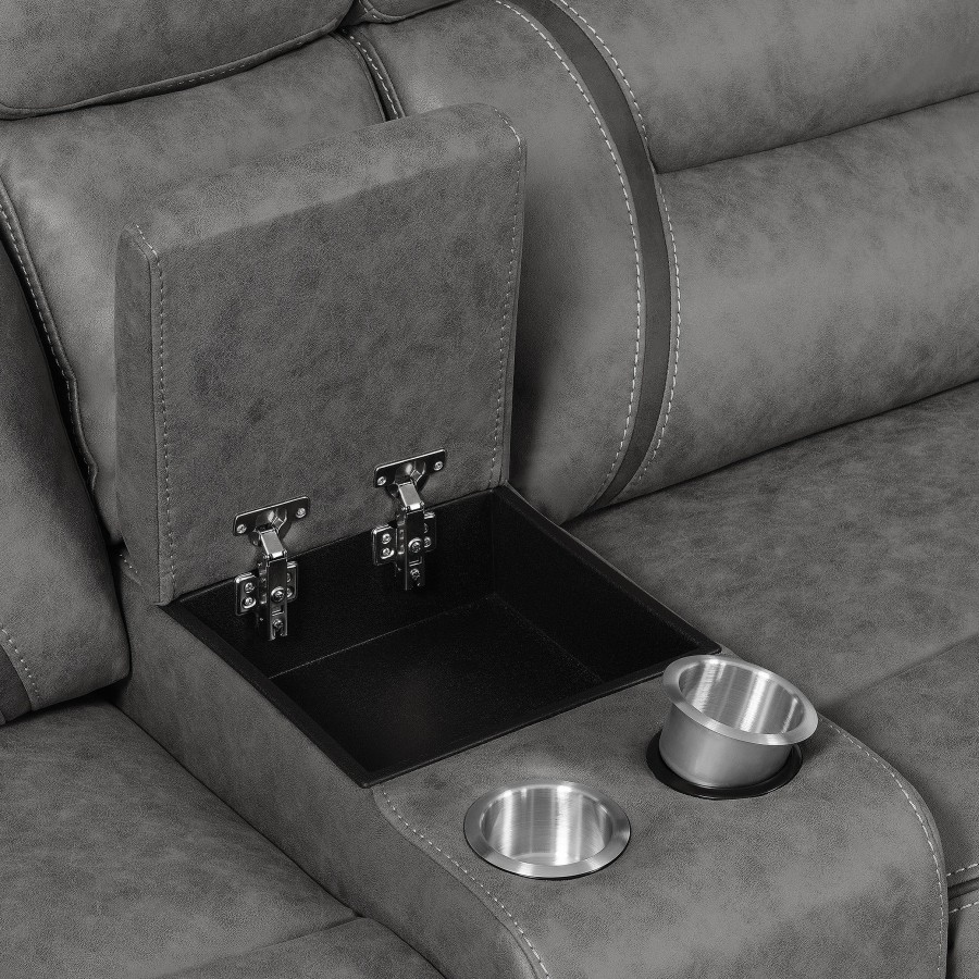 This left-arm facing power reclining loveseat offers premium comfort and functionality within a modular sectional. Upholstered in soft grey microfiber, it features plush cushioning, a supportive channel-tufted backrest, and padded armrests for enhanced relaxation. A center console with built-in cupholders and storage keeps essentials within reach. The power reclining function provides smooth, effortless adjustments at the touch of a button.