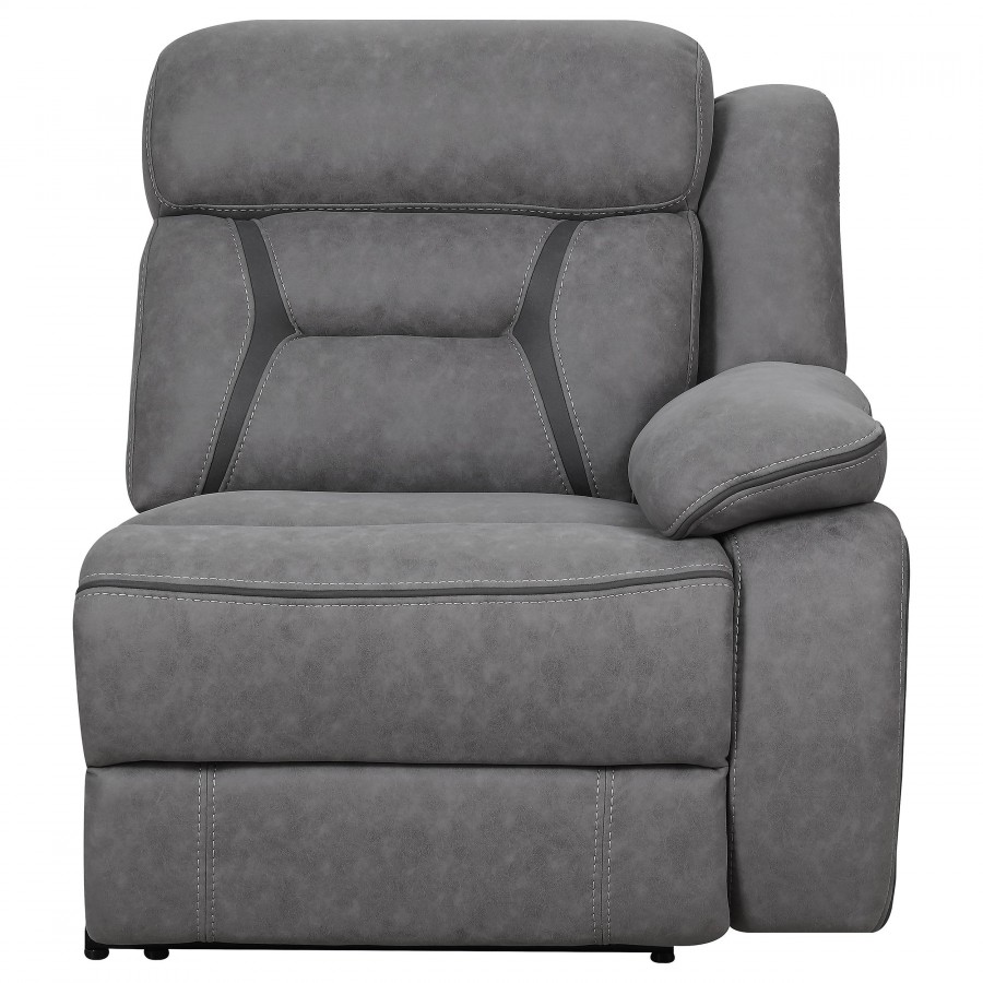 This right-arm facing power recliner enhances modular sectional layouts with effortless reclining and plush comfort. Upholstered in soft grey microfiber, it features a supportive channel-tufted backrest, padded armrests, and deep cushioning for superior relaxation. The power reclining mechanism allows for smooth adjustments at the touch of a button, providing customizable comfort. Built with durable construction, it offers long-lasting support and stability.