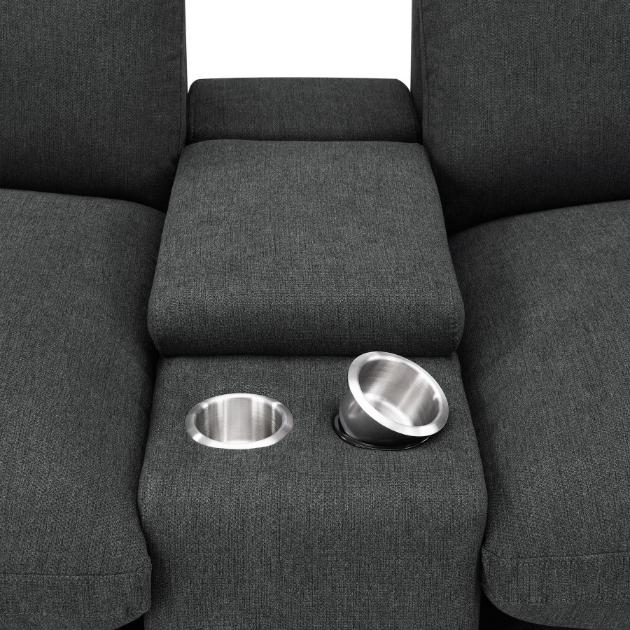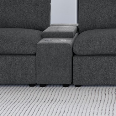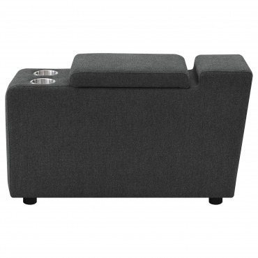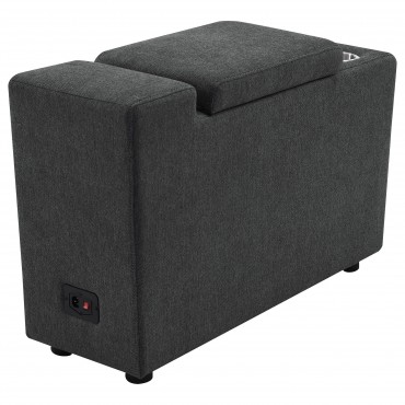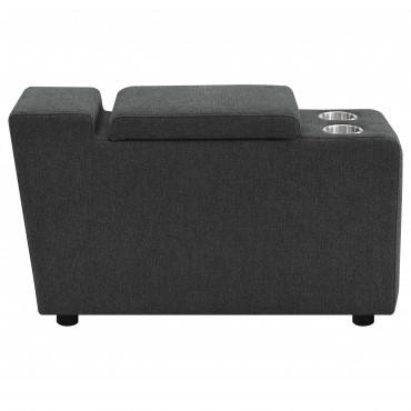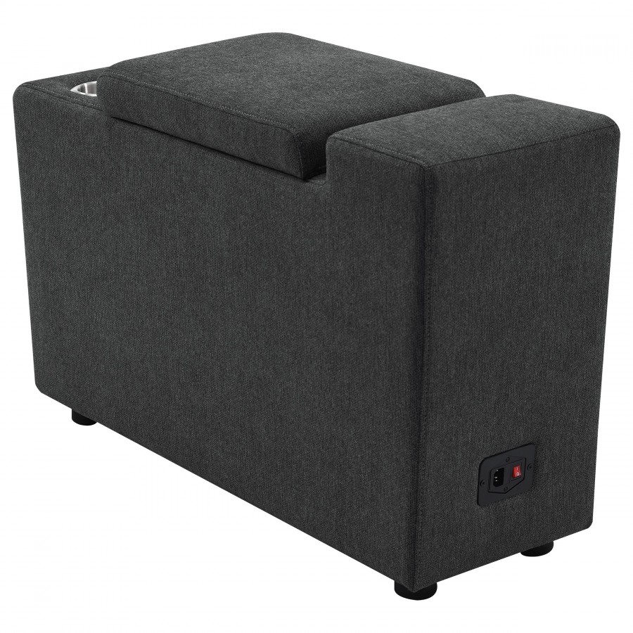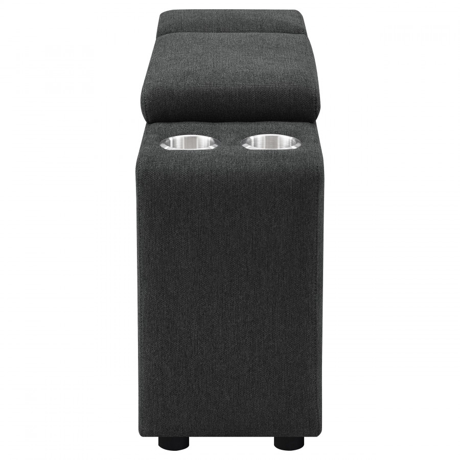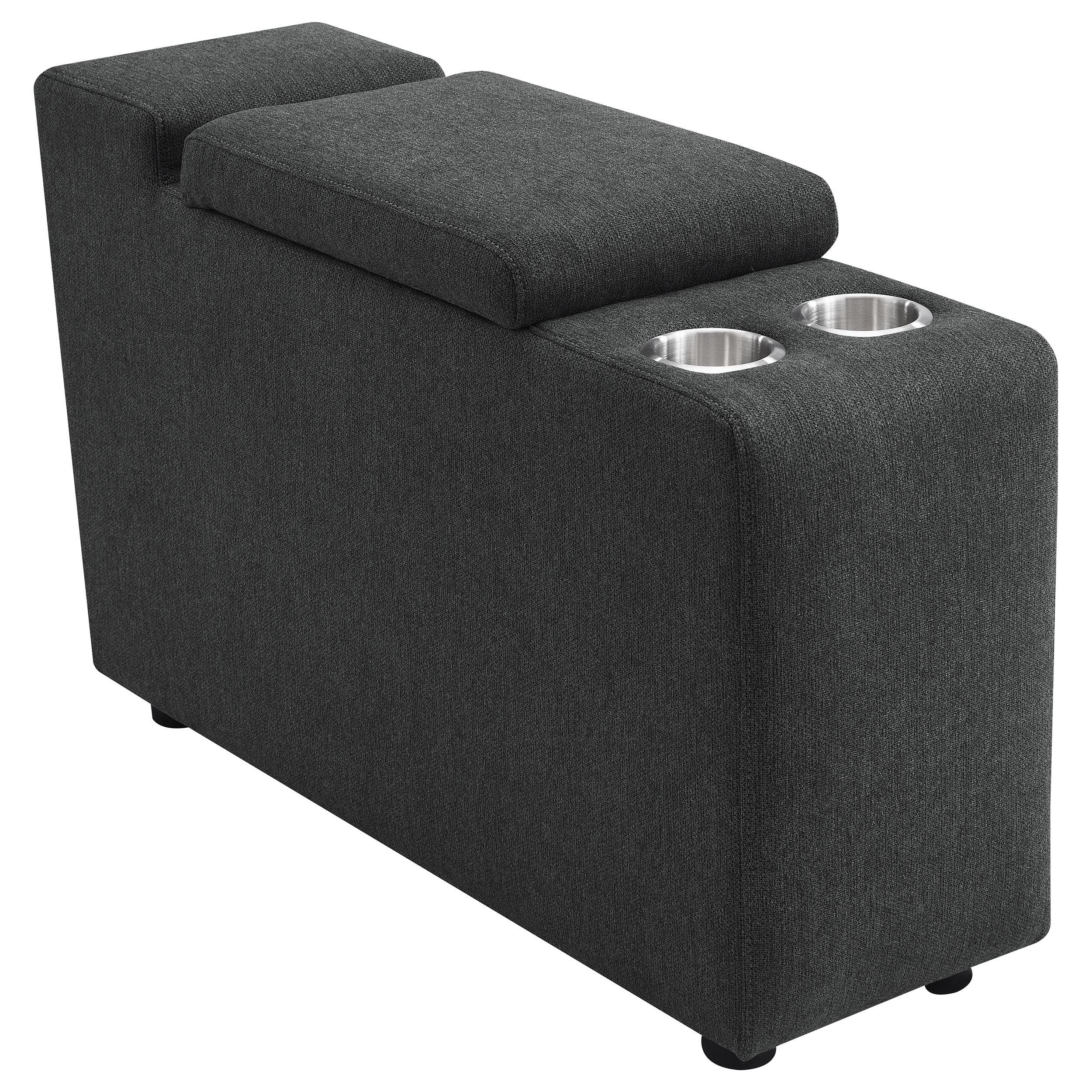 Elevate your sectional with this versatile console, designed to seamlessly integrate into your modular setup. Featuring a lift-top storage compartment for discreet organization and two stainless steel cup holders, this console enhances both functionality and convenience. Its compact design adds practical features without taking up extra space, making it a perfect addition to modern living spaces.
