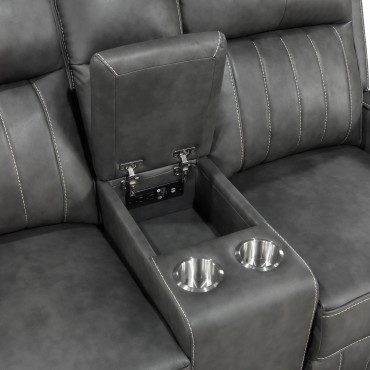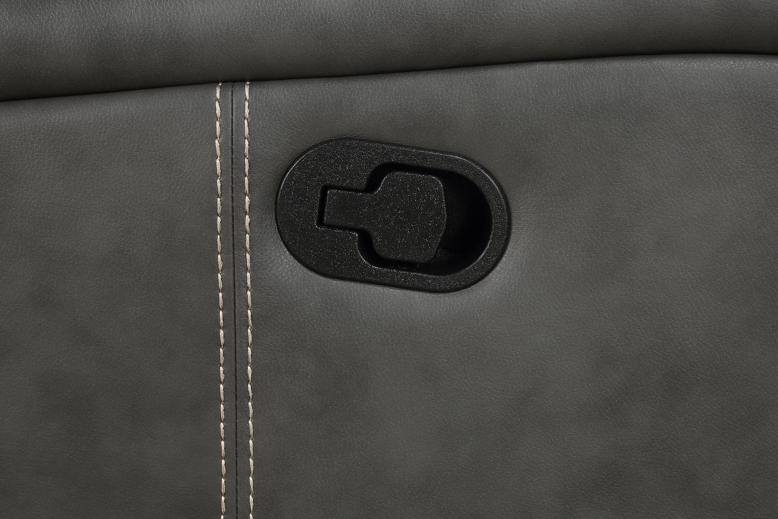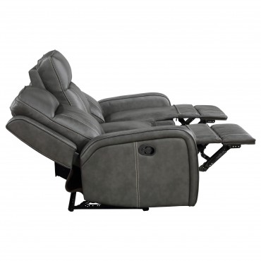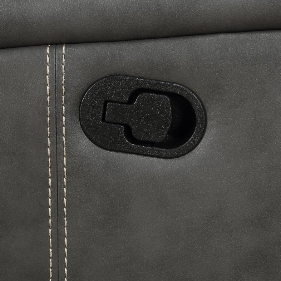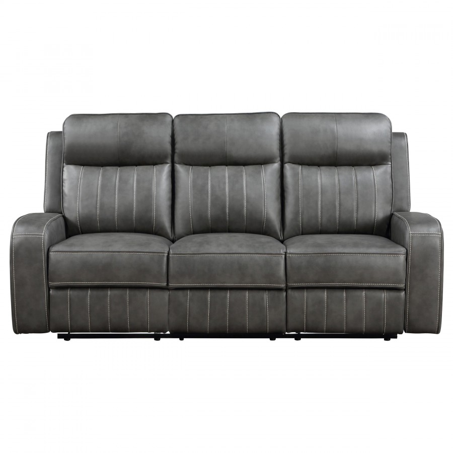 Relax in style with this transitional motion sofa set that blends modern and contemporary design. Each piece is upholstered in smooth grey leatherette with vertical topstitching for decorative detail and added dimension. Plush foam padding and pocket coil seating provide long-lasting support, while ultra-padded headrests enhance comfort. Manual reclining seats with a wall-hugger design maximize space efficiency. For added functionality, the loveseat includes a center storage console with dual cup holders.