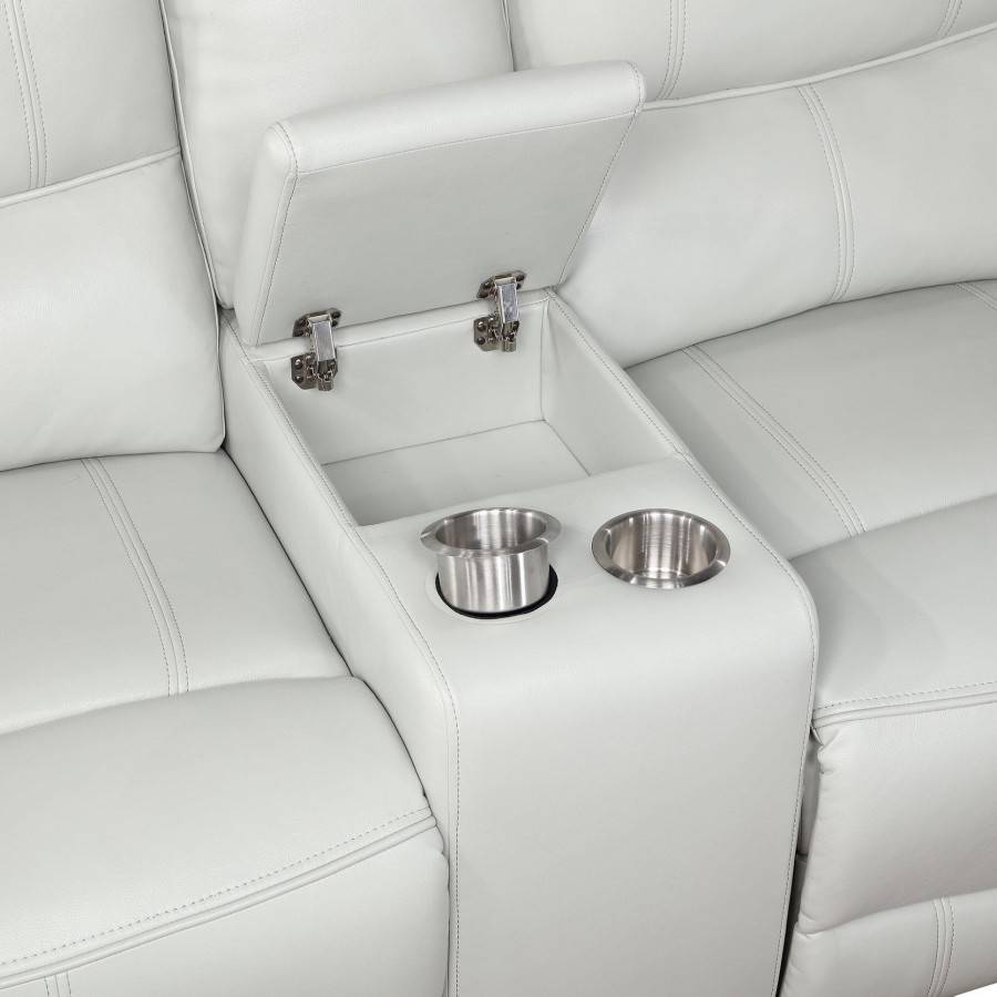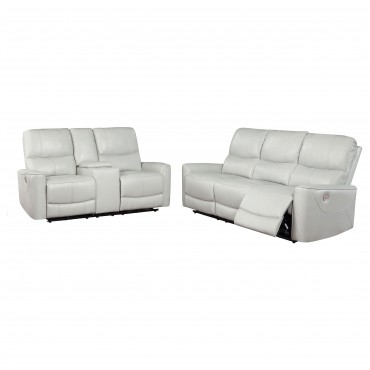 Contemporary elegance plays out in a clean, modern design as the two-piece power sofa set delivers beauty and comfort to a space reserved for easy entertaining and relaxing. Dove grey leatherette upholstery covers wood framing to provide a sturdy build, embellished with plump foam fill in tall, attached back cushions and supportive seat cushions. Embrace subtle tufting on this power sofa and loveseat set creating customized body positioning accessible at the touch of buttons on switch panels with convenient USB ports. Keep beverages within reach and store essentials in a center-mounted loveseat flip-top console and panel. This power set is all that's needed for a relaxing day or evening.