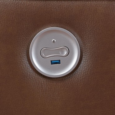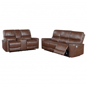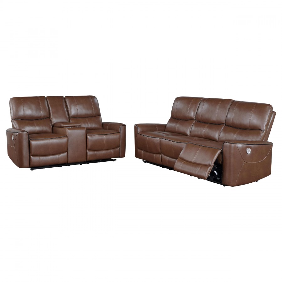 Contemporary elegance plays out in a clean, modern design as the two-piece power sofa set delivers beauty and comfort to a space reserved for easy entertaining and relaxing. Saddle brown leatherette upholstery covers wood framing to provide a sturdy build, embellished with plump foam fill in tall, attached back cushions and supportive seat cushions. Embrace subtle tufting on this power sofa and loveseat set creating customized body positioning accessible at the touch of buttons on switch panels with convenient USB ports. Keep beverages within reach and store essentials in a center-mounted loveseat flip-top console and panel. This power set is all that's needed for a relaxing day or evening.