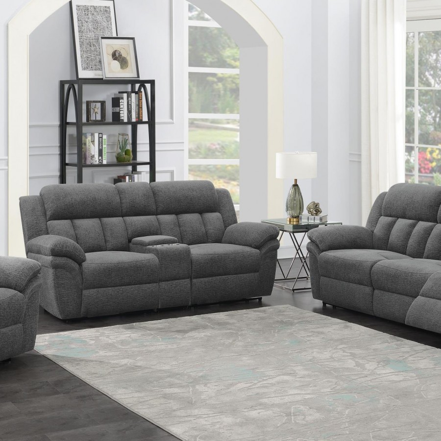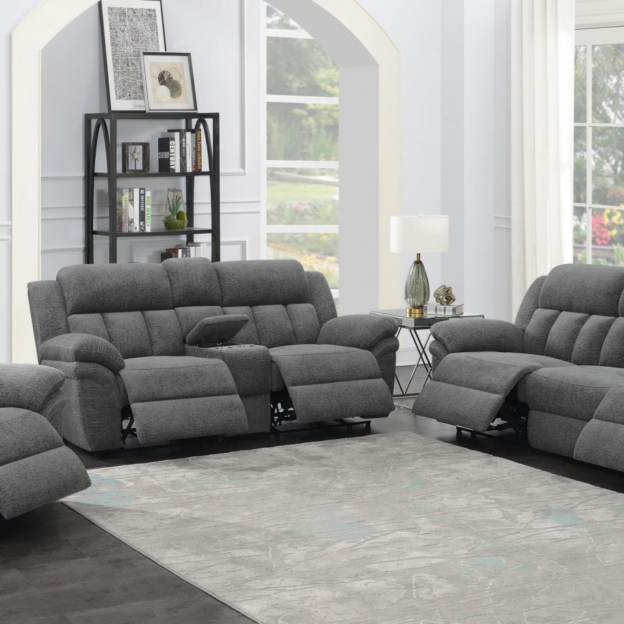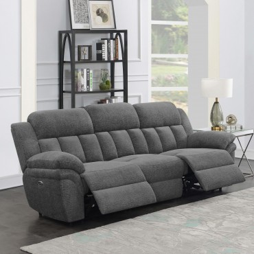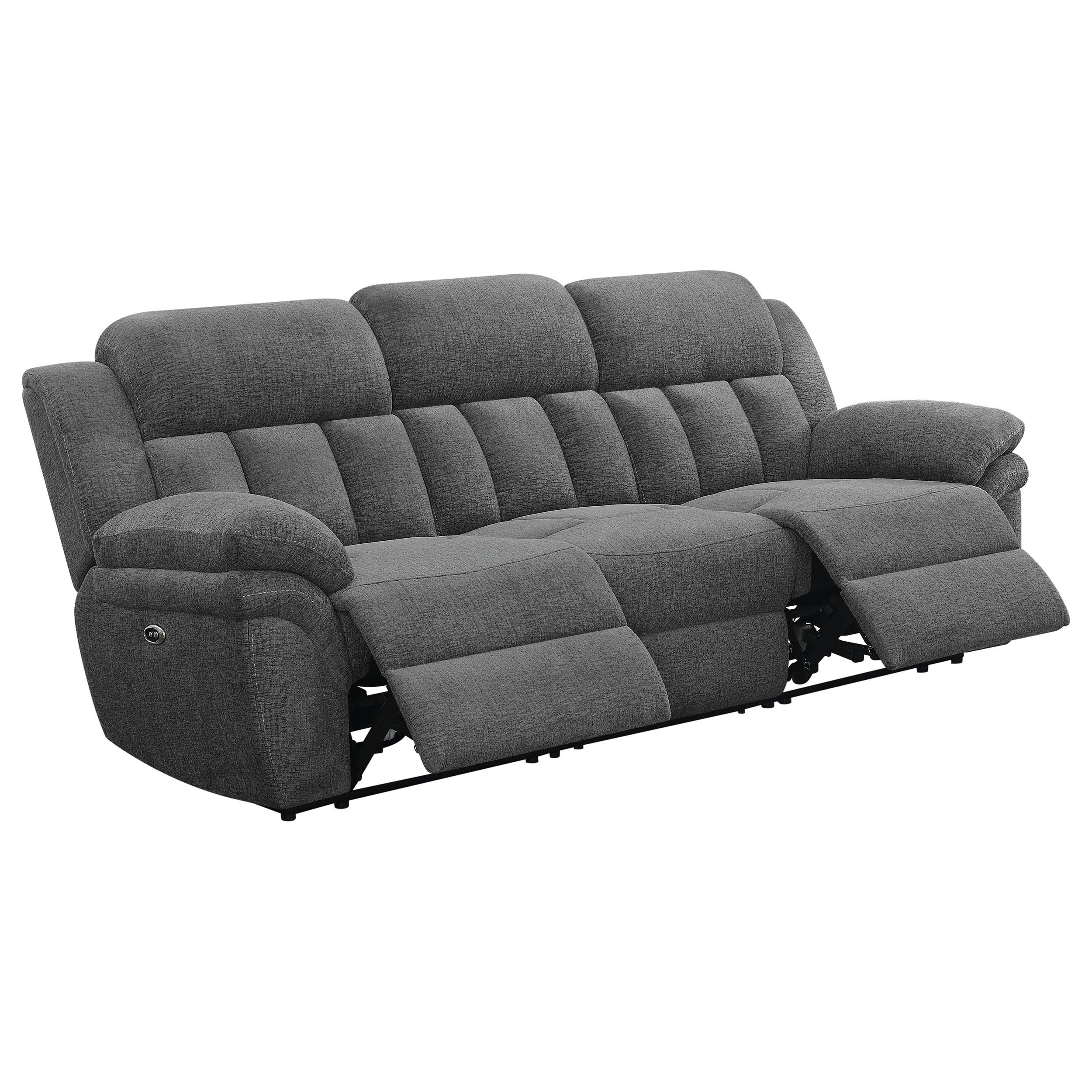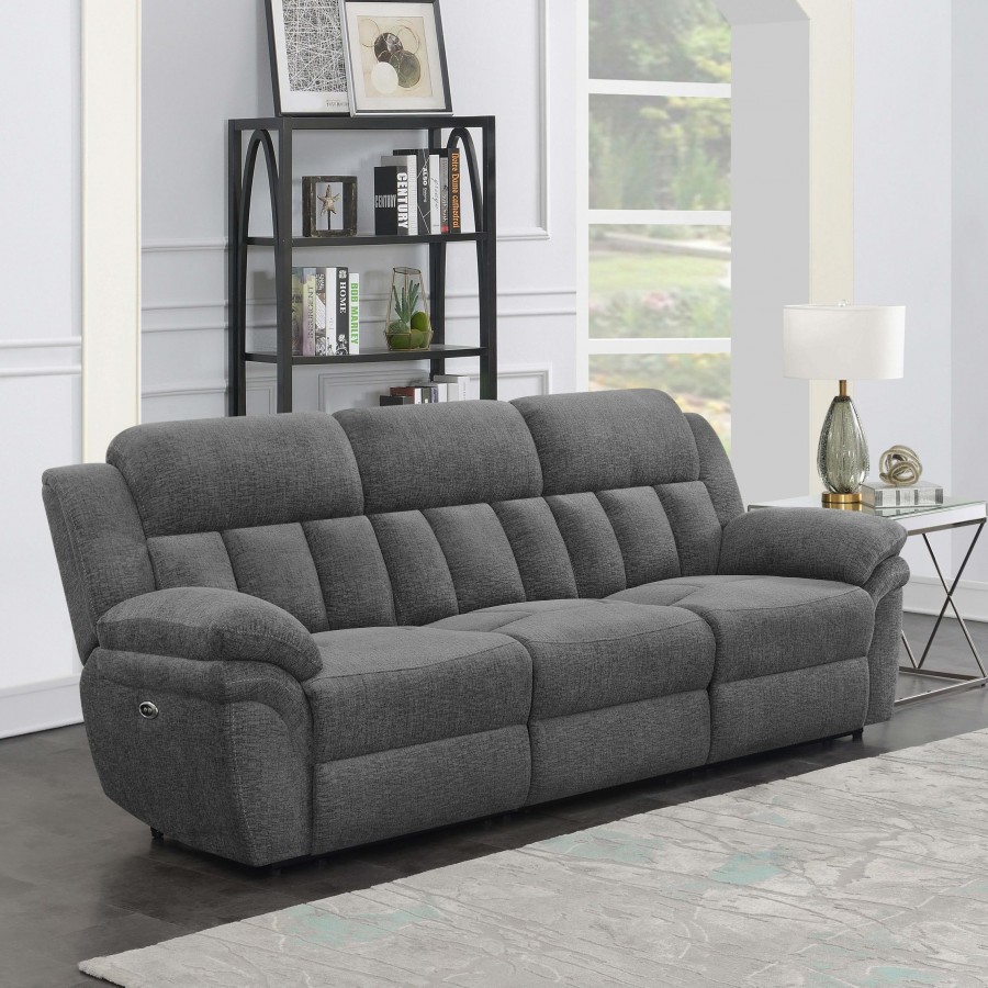 Kick back and relax with the dual power recliners featured in a transitional reclining sofa. Built for indulgent comfort, it features plush and supportive seating, with tufting that adds dimension and structure. Extra-thick pillowtop arms are ideal for lounging or even a quick afternoon power nap. Charcoal gray upholstery is rich and neutral to complement a variety of color palettes and surrounding decor. Complete with power recline at the touch of a button for smooth, easy performance you can count on for comfort and relaxation.