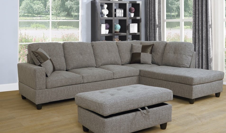 The beautiful  grey fabric sectional couch set come with chaise,ottoman,2 square pillows.suitable for any traditional and contemporary home in your living room, den or office. Designed with sturdy wood frame constructed, seat and back cushions filled with high density memory foam padding, and base covered in high quality textile grey fabric. the sectionals are easy to assemble. offer customer maximum comfort no matter where you choose to sit.