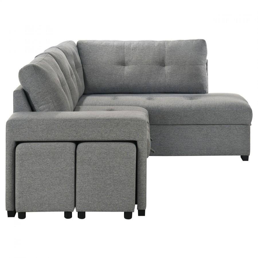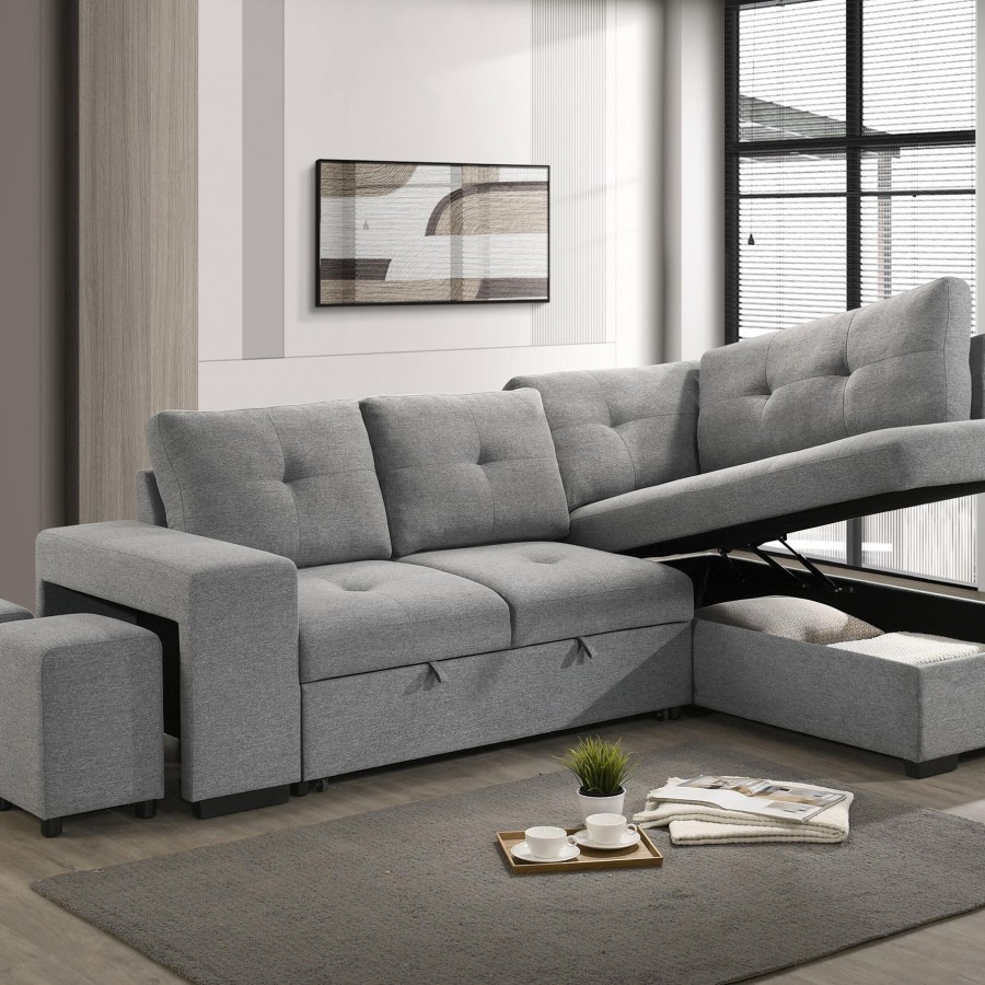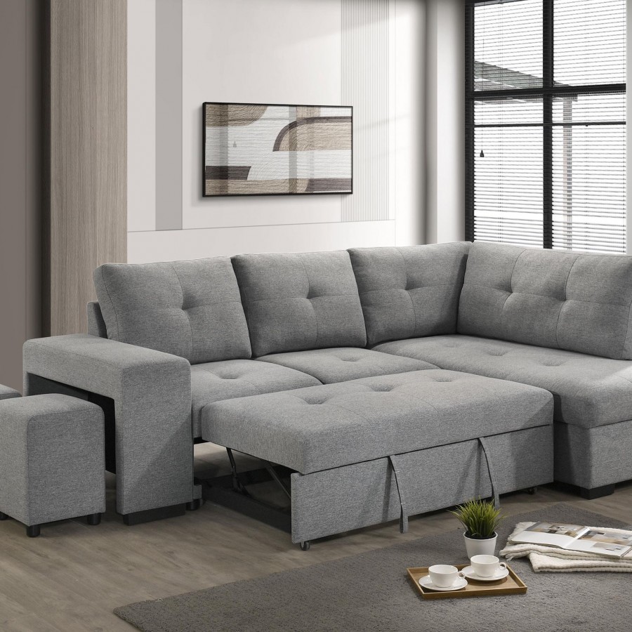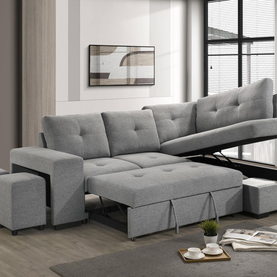 Effortlessly blending beauty and utility, this sleeper sectional invites you to unwind in tailored comfort. Draped in soft grey fabric, its tufted cushions exude quiet elegance, while the generous silhouette offers space to stretch, gather, or dream. Two upholstered stools nest neatly within the armrest, ready for extra seating in an instant. A pull-out bed welcomes overnight guests, and the chaise conceals spacious hidden storage—perfectly designed for life lived beautifully.
