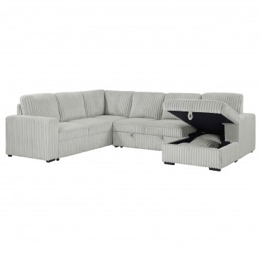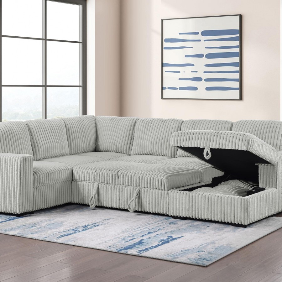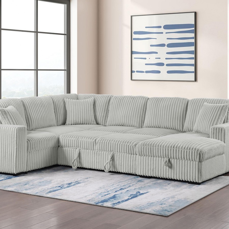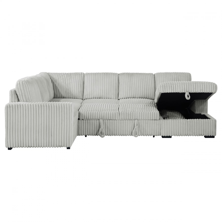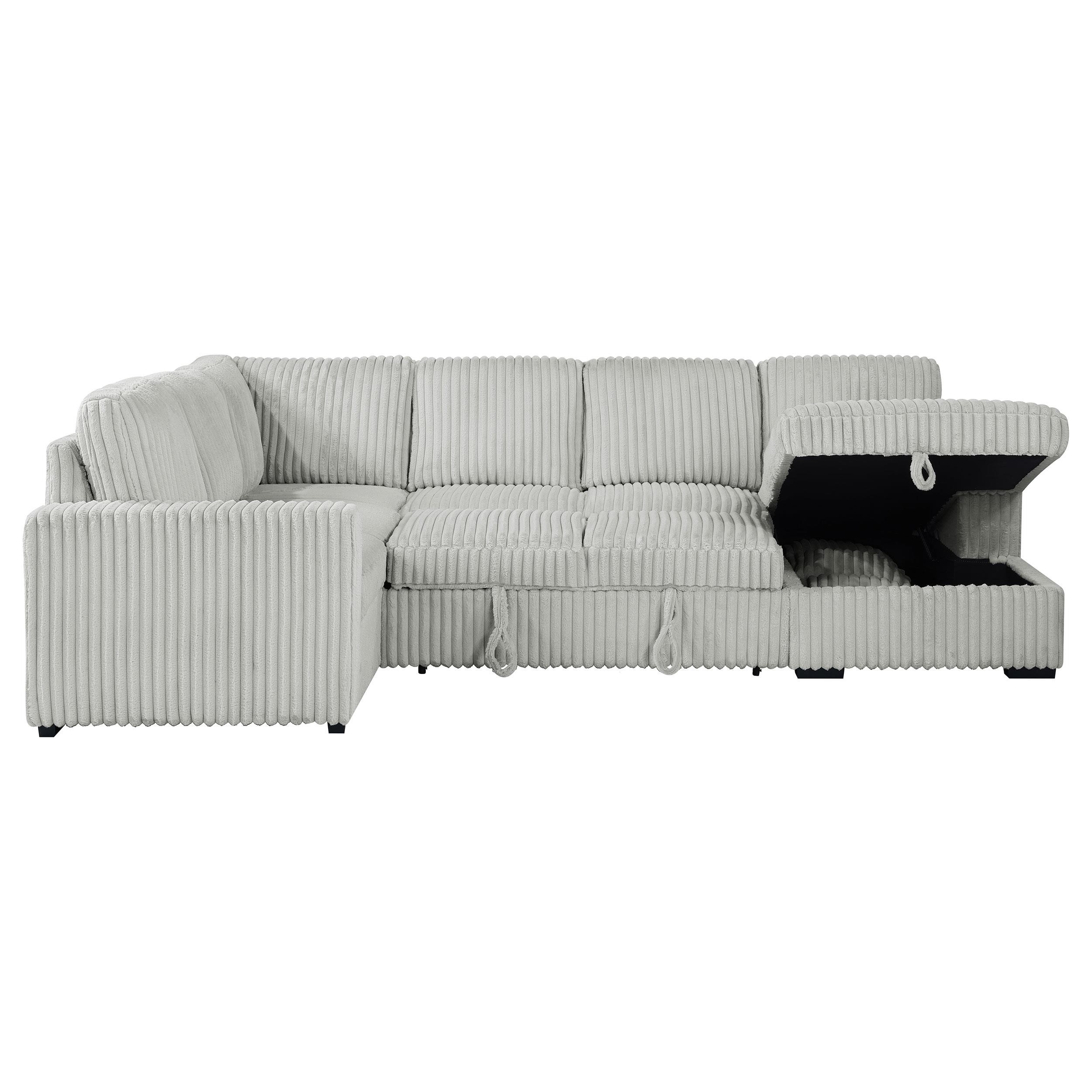 This versatile corduroy sleeper sectional effortlessly converts from cozy seating to a comfortable guest bed with its pop-up sleep surface. A spacious storage chaise keeps essentials at hand, while plush upholstery and three matching pillows provide lasting comfort and style. Its neutral tone complements any décor, making this piece an ideal centerpiece for relaxation, entertainment, and accommodating overnight guests. Built for durability, it seamlessly blends form, function, and modern appeal.