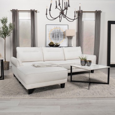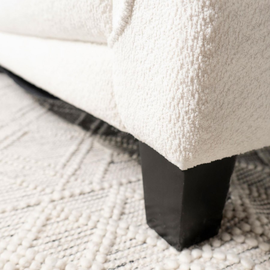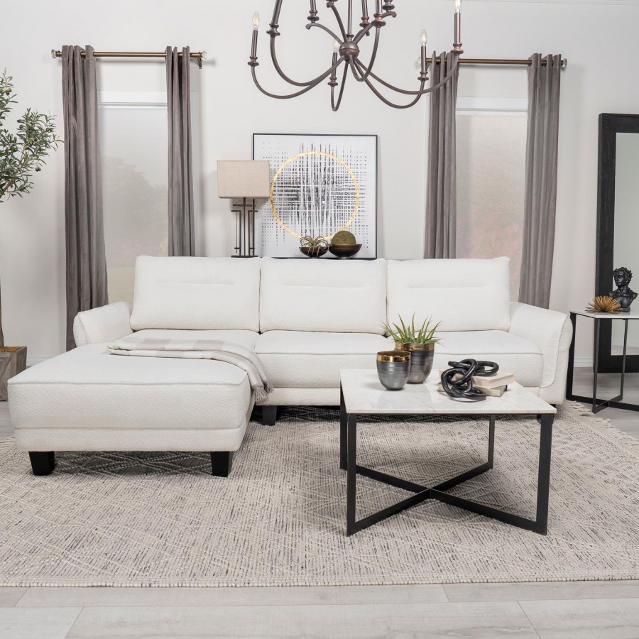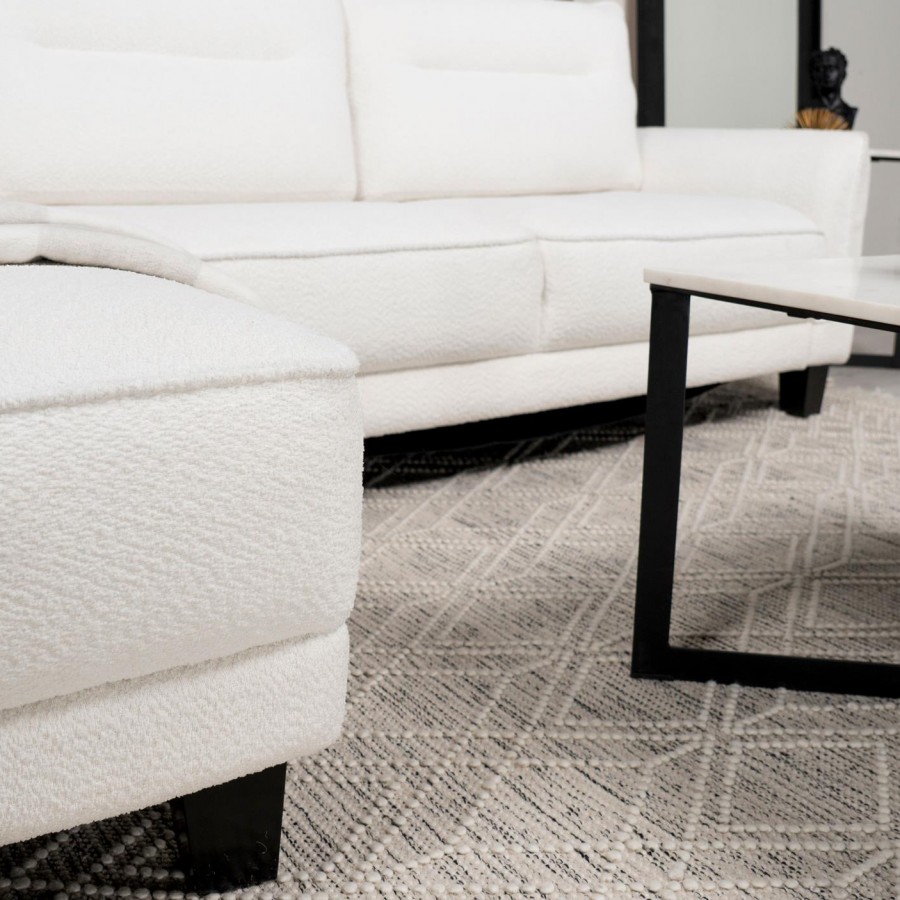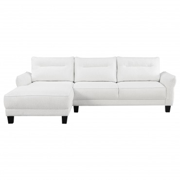 Experience ultimate comfort with this modern two-piece sofa chaise, available in grey or white. The fuzzy teddy bear-like textured fabric upholstery creates a cozy atmosphere. The softly rounded arms and welt framed reversible back cushions add a touch of sophistication. With attached welt-accented boxed seats and solid wood tapered legs, this sectional ensures a well-kept appearance and sturdy foundation.