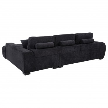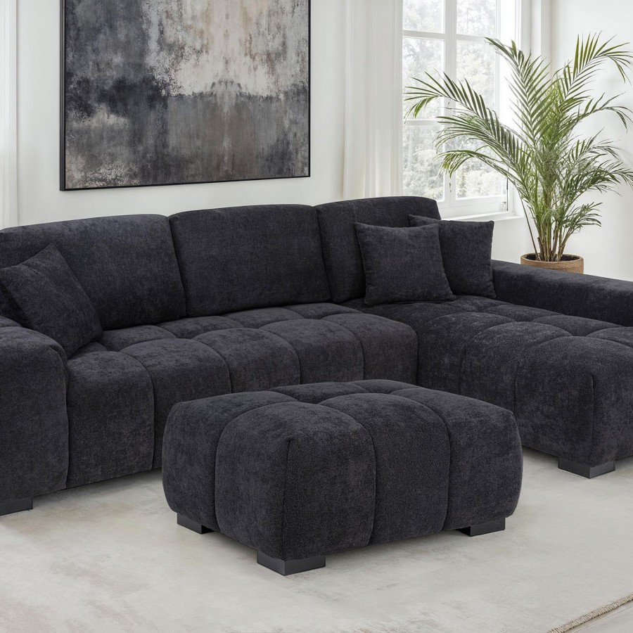 Striking in form and sumptuous in feel, this sectional sofa wraps the room in sculptural elegance. Channel tufting cascades across every curve, drawing the eye along its bold, pillowy silhouette. Wide track arms and generous proportions invite endless lounging, while the soft black fabric cloaks each surface in depth and drama. Crafted for comfort and presence, it brings artful serenity to the heart of the home.