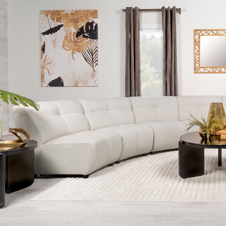 Make a living room or media room the favorite choice for guests and family with a five-piece sectional sofa with minimalism and sophistication woven into its streamlined design. The sectional sofa cuts to the chase with an ultra-comfortable seating experience and subtly rounded profile, perfect for socializing. Durable ivory fabric is soft and inspiring, lending a versatile element to match or coordinate with surrounding décor. This sectional aligns eight armless pieces for a customized configuration and features contemporary design elements with plump, foam-filled framing and decorative tufting adding dimensionality and classic style. A focal point in any space, the sectional sofa accommodates several visitors and adds a low-key, easy motif.