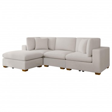 Plush cushions and streamlined design bring appealing flair to a modern modular sectional sofa. This design includes an ottoman that creates a stylish chaise or takes the place of a coffee table, offering a plush, cozy ambiance in your living room. It boasts soft, inviting upholstery in a neutral hue, setting the tone for a stylish living space. Smooth cushions creates exceptional comfort, while understated track arms ensure a clean-lined silhouette. This sectional is the perfect solution in a family space built for inviting comfort.