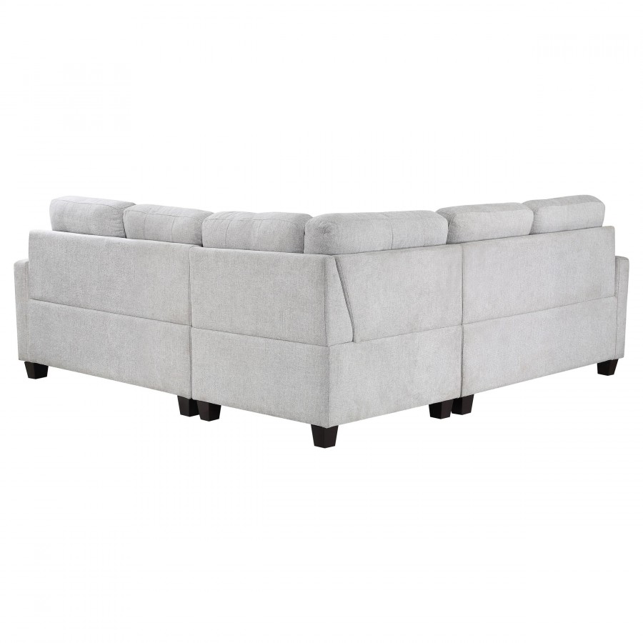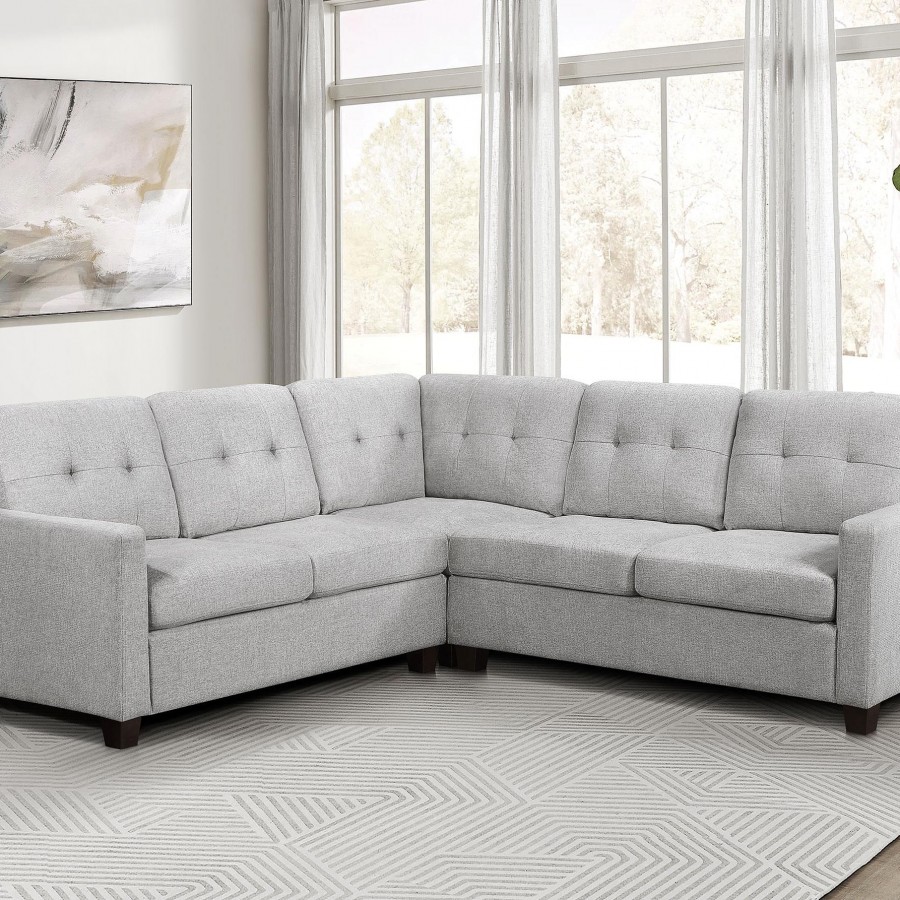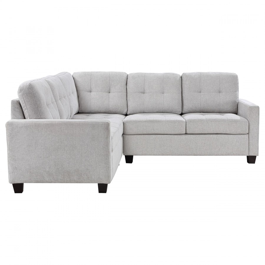 Entertaining is a breeze with a transitional style motif as the sectional set assembles pieces forming an L-shaped sofa, ideal for family rooms and media venues. Classic design elements are pleasing, as wood framing forms a straight box base and slender track arms. Gorgeous fabric upholstery opens up options for blending with room color palettes. Sit in relative luxury on foam-padded attached seat cushions and against reversible back cushions, all with subtle tufting. Chunky wood feet deliver a fun iconic embellishment to a set that includes one corner chair, one left-facing loveseat, and one right-facing loveseat.