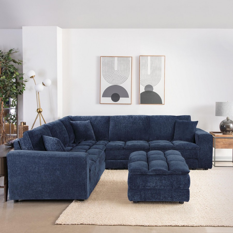 This retro-inspired modular sectional brings a blend of comfort and contemporary style to your living space. Featuring soft blue corduroy upholstery and a sophisticated grid-tufted design, it delivers both elegance and coziness. The fully encased solid and engineered wood frame ensures stability for heavy use, while sinuous spring seating and pocket coil springs provide exceptional support and durability. A matching tufted ottoman adds versatility, offering extra seating or leg support for a complete lounging experience.