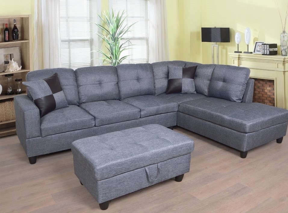 The beautiful  grey fabric sectional couch set come with chaise,ottoman,2 square pillows.suitable for any traditional and contemporary home in your living room, den or office. Designed with sturdy wood frame constructed, seat and back cushions filled with high density memory foam padding, and base covered in high quality textile greyish/blueish fabric. the sectionals are easy to assemble. offer customer maximum comfort no matter where you choose to sit.