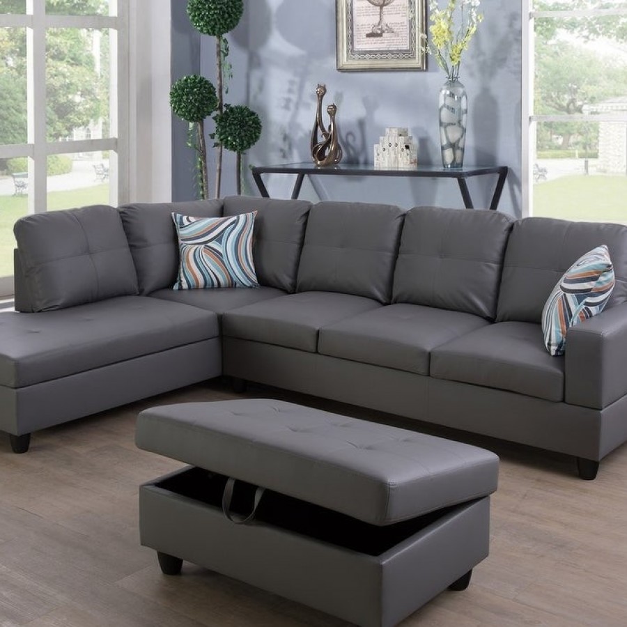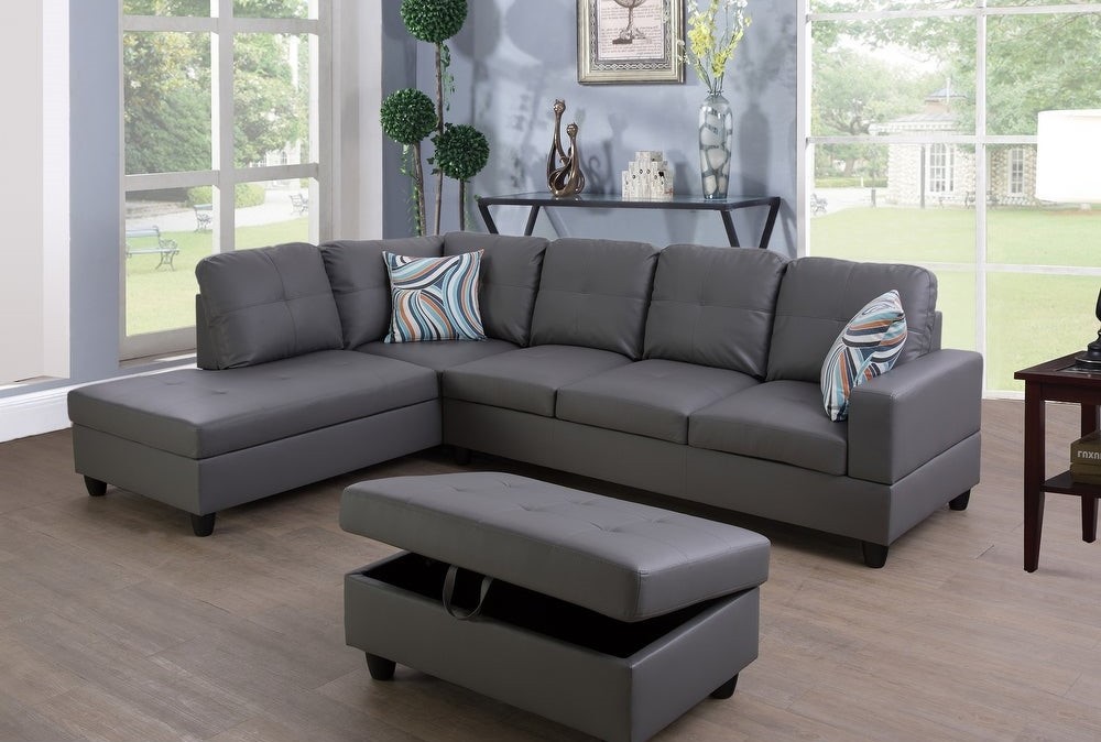 This beautiful sectional couch set come with chaise,ottoman,2 square pillows. suitable for any traditional and contemporary home in your living room, den or office. Designed with sturdy wood frame constructed, seat and back cushions filled with high density memory foam padding covered in high-quality faux leather, easy to clean. offer customer maximum comfort no matter where you choose to sit, easy to assemble.