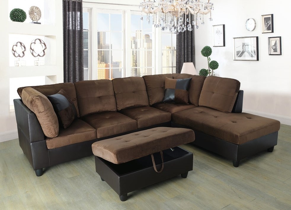 The beautiful  chocolate fabric sectional couch set come with chaise,ottoman,2 square pillows.suitable for any traditional and contemporary home in your living room, den or office. Designed with sturdy wood frame constructed, seat and back cushions filled with high density memory foam padding, and base covered in high quality textile brown velvet fabric. the sectionals are easy to assemble. offer customer maximum comfort no matter where you choose to sit.