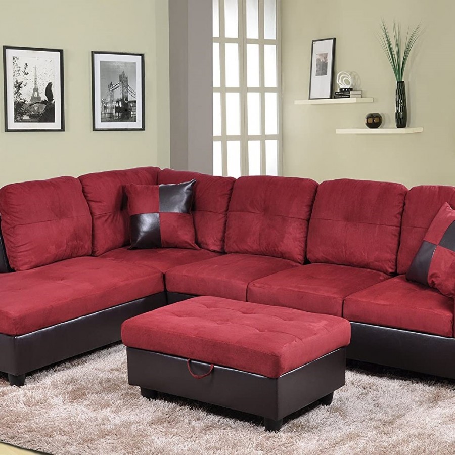 The beautiful  burgundy microfiber fabric sectional couch set come with chaise,ottoman,2 square pillows.suitable for any traditional and contemporary home in your living room, den or office. Designed with sturdy wood frame constructed, seat and back cushions filled with high density memory foam padding, and base covered in high quality textile burgundy  fabric. the sectionals are easy to assemble. offer customer maximum comfort no matter where you choose to sit.