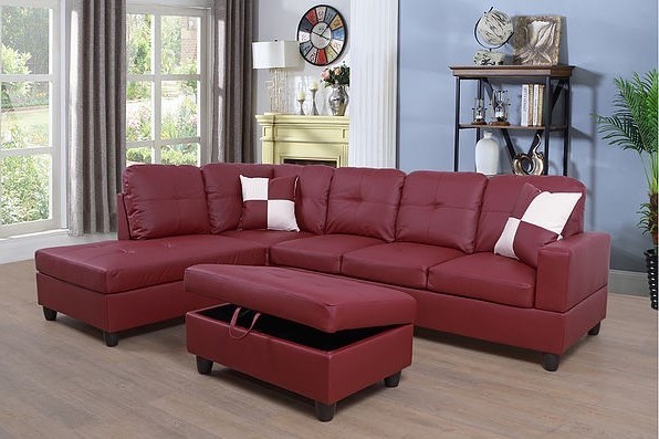 This beautiful sectional couch set come with chaise,ottoman,2 square pillows. suitable for any traditional and contemporary home in your living room, den or office. Designed with sturdy wood frame constructed, seat and back cushions filled with high density memory foam padding covered in high-quality faux  burgundy leather, easy to clean. offer customer maximum comfort no matter where you choose to sit, easy to assemble.