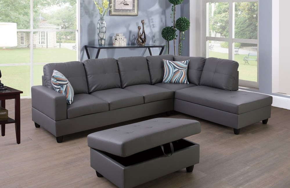 This beautiful sectional couch set come with chaise,ottoman,2 square pillows. suitable for any traditional and contemporary home in your living room, den or office. Designed with sturdy wood frame constructed, seat and back cushions filled with high density memory foam padding covered in high-quality grey faux leather, easy to clean. offer customer maximum comfort no matter where you choose to sit, Easy to assemble.