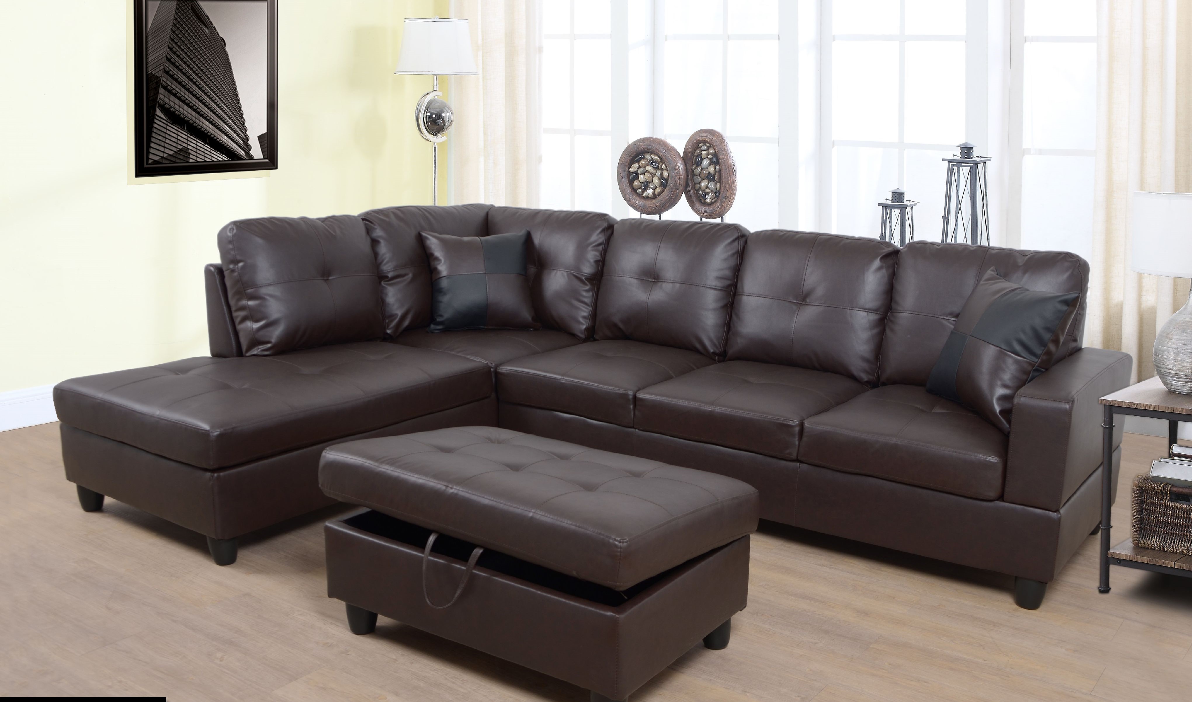 This beautiful sectional couch set come with chaise,ottoman,2 square pillows. suitable for any traditional and contemporary home in your living room, den or office. Designed with sturdy wood frame constructed, seat and back cushions filled with high density memory foam padding covered in high-quality faux  brown leather, easy to clean. offer customer maximum comfort no matter where you choose to sit, easy to assemble.