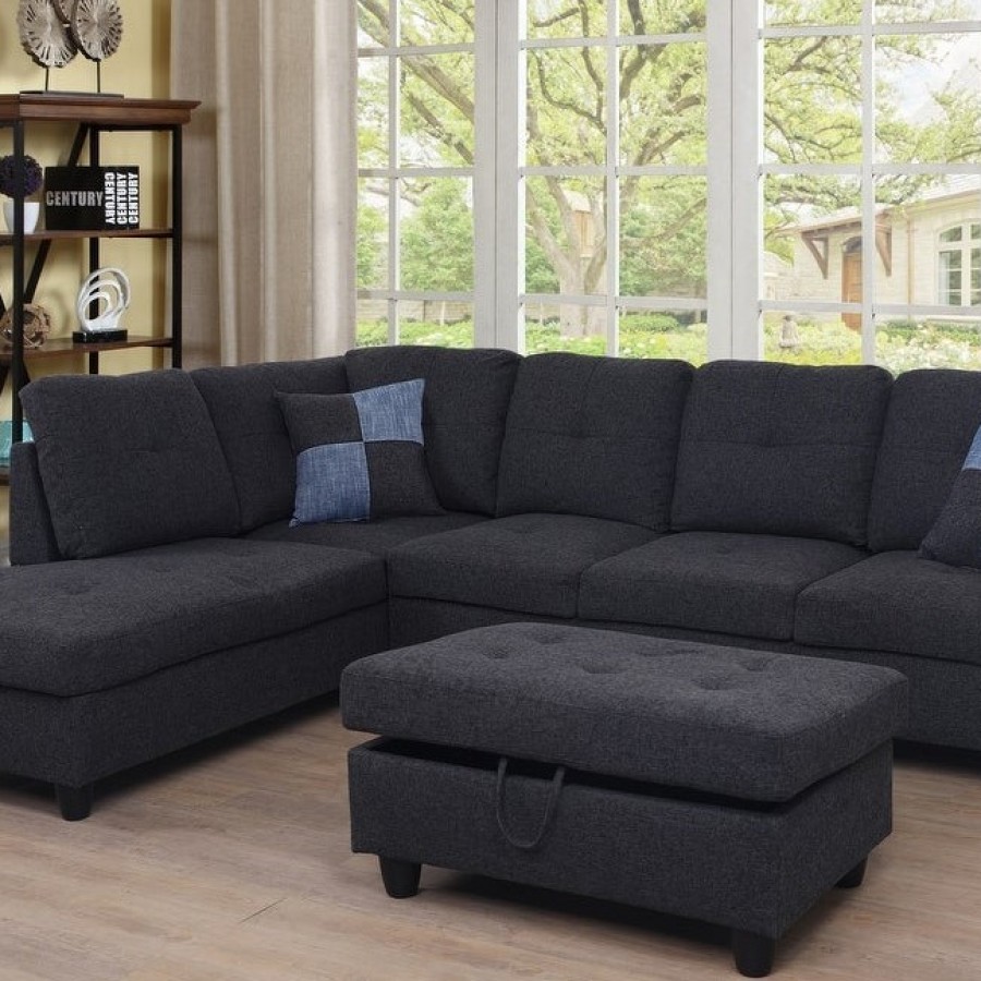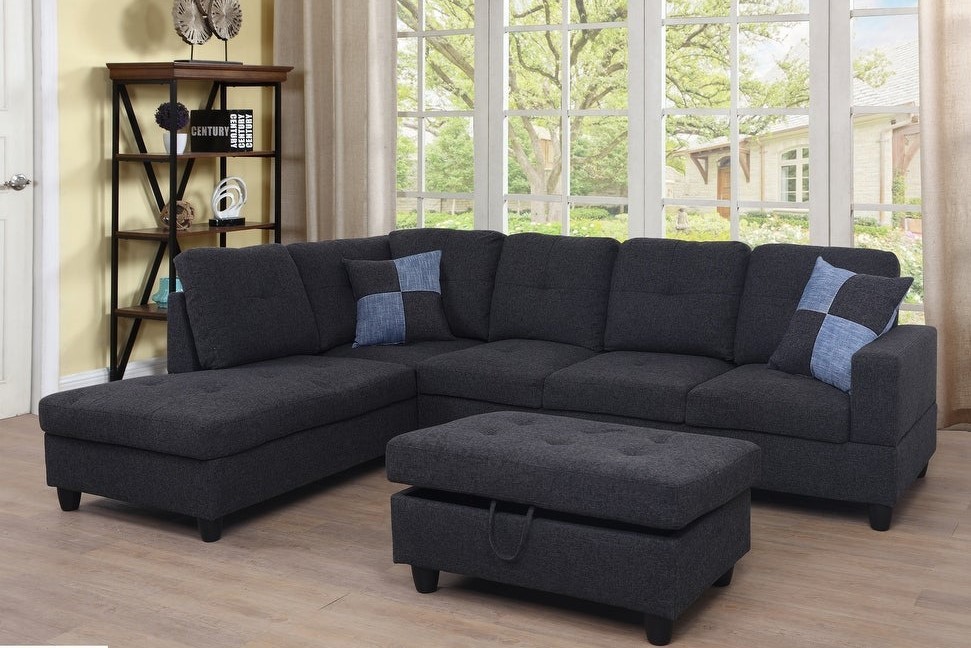The beautiful sectional couch set come with chaise,ottoman,2 square pillows. suitable for any traditional and contemporary home in your living room, den or office.Designed with sturdy wood frame constructed, seat and back cushions filled with high density memory foam padding,and base covered in high quality textile grey fabric. the sectionals are easy to assemble. offer customer maximum comfort no matter where you choose to sit.