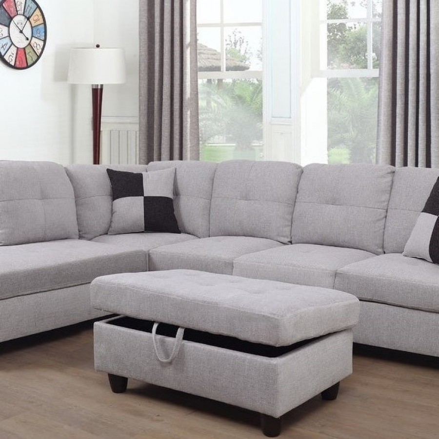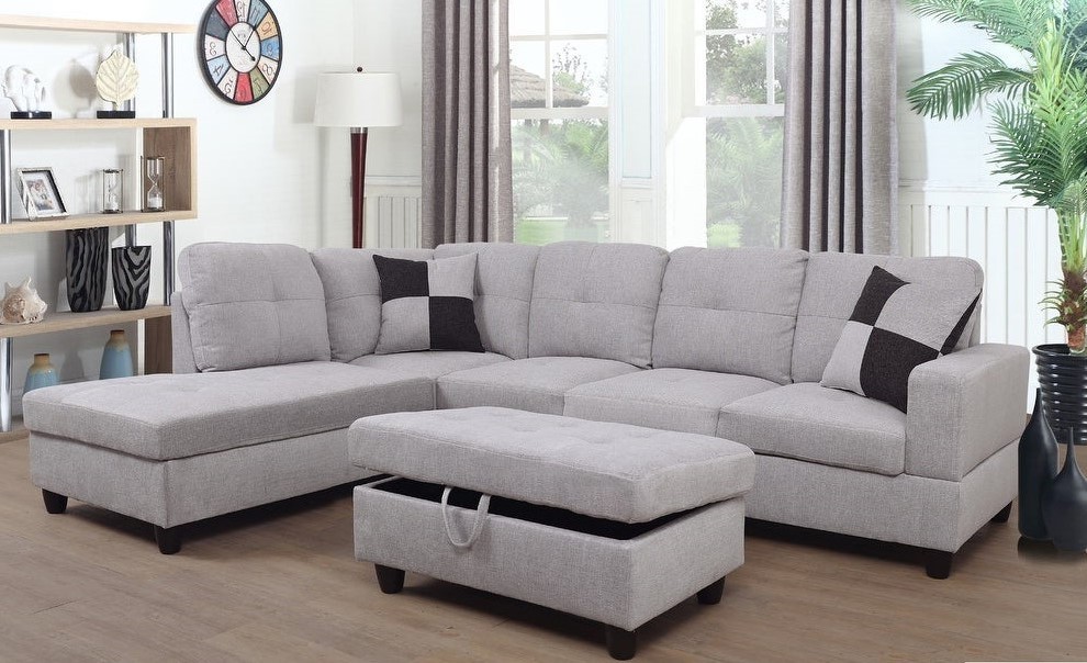 The beautiful light grey fabric sectional couch set come with chaise,ottoman,2 square pillows.suitable for any traditional and contemporary home in your living room, den or office. Designed with sturdy wood frame constructed, seat and back cushions filled with high density memory foam padding, and base covered in high quality textile light grey fabric. the sectionals are easy to assemble. offer customer maximum comfort no matter where you choose to sit.
