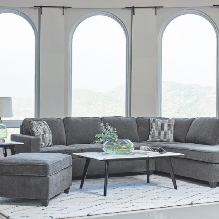 Enjoy a new family favorite for your living room, den, or entertainment room. This reversible 2-piece transitional sectional is a handsome addition to your home. Lounge in comfort on the plush dark grey chenille fabric seat and back cushions and rest your elbows on the armrests, all accented with self-welt details. Extra throw pillows come included for those occasions when a nap is necessary. For convenience, the reversible spacious chaise is perfect to recline on, and the dark brown tall tapered legs give the sectional added height.