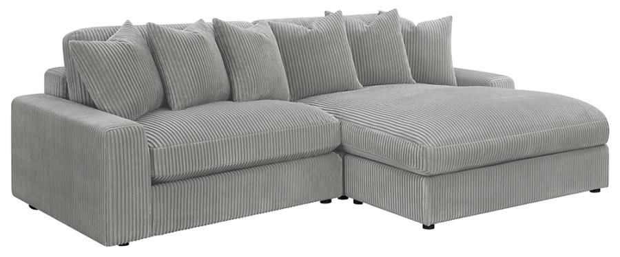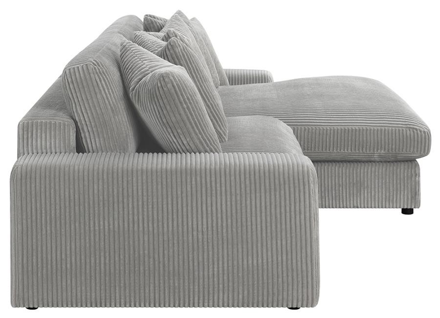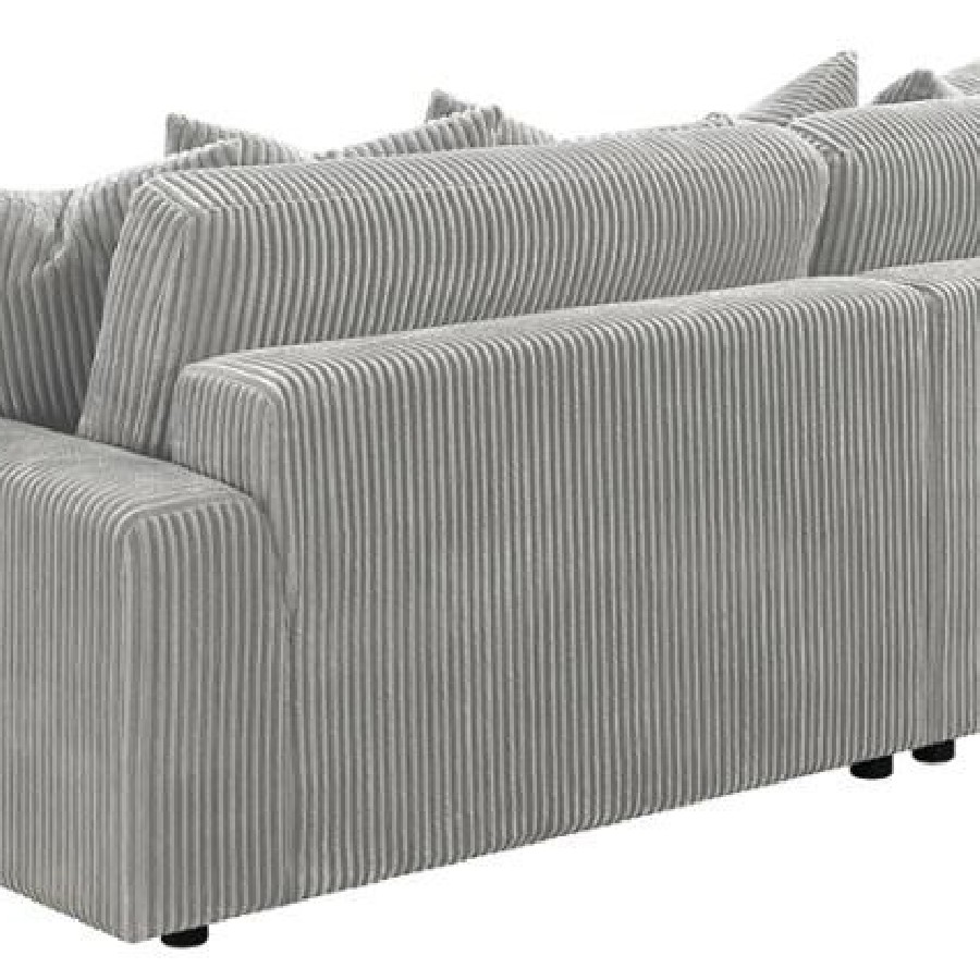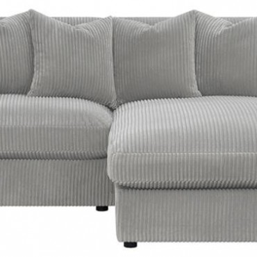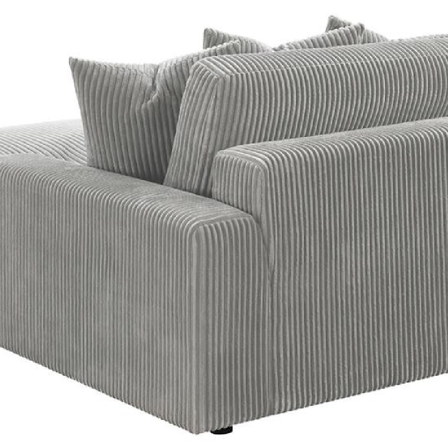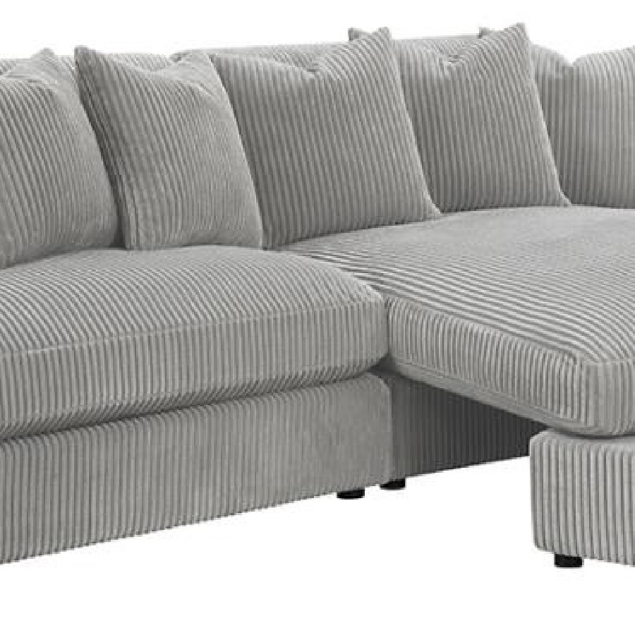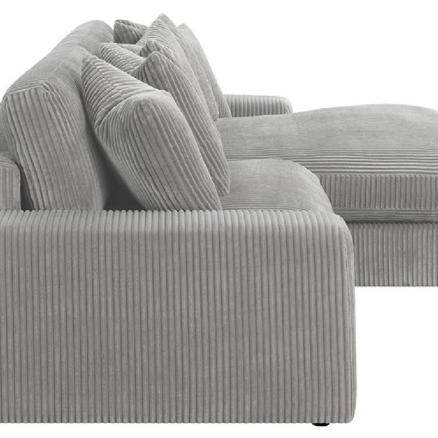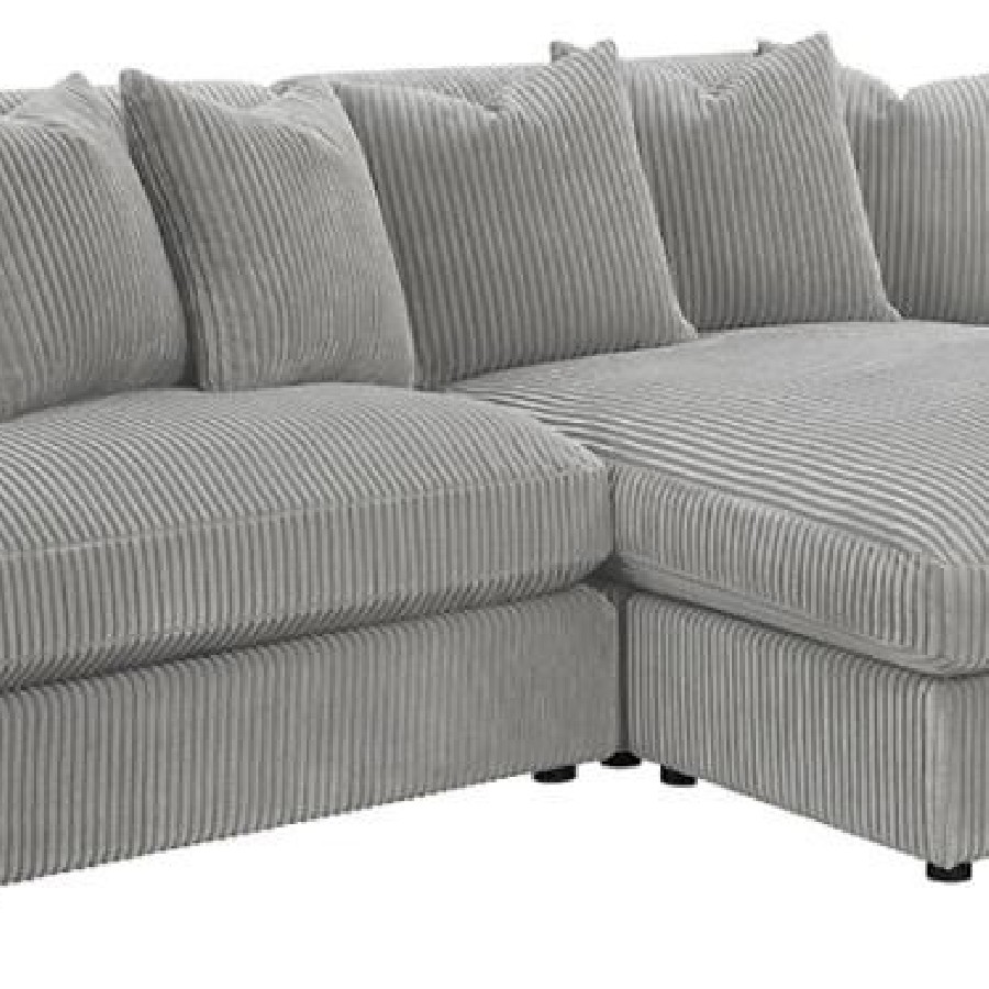 Add a retro-inspired look to your contemporary bedroom with this modern reversible sectional sofa, upholstered in a vintage-like wide corduroy performance fabric that offers a soft texture and an elegant fog tone. Each of the two pieces are appointed with reversible seats and back cushions that offer a versatile design, complete with wide track arms, black legs, and non-slip grips to hold everything in place.