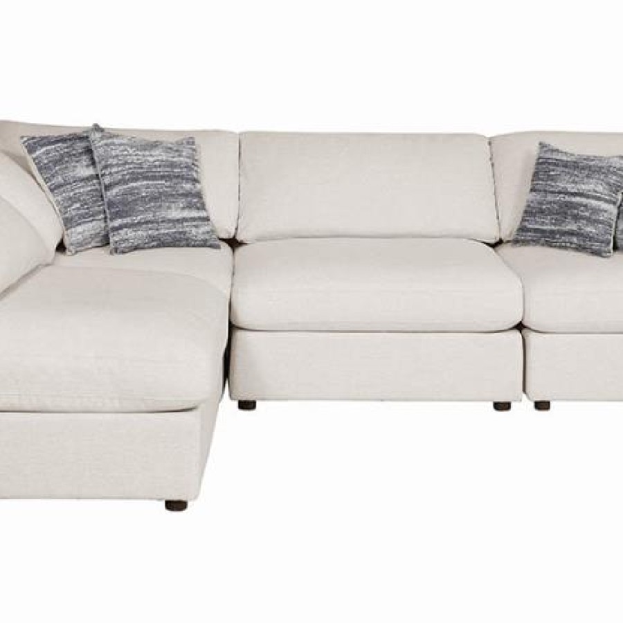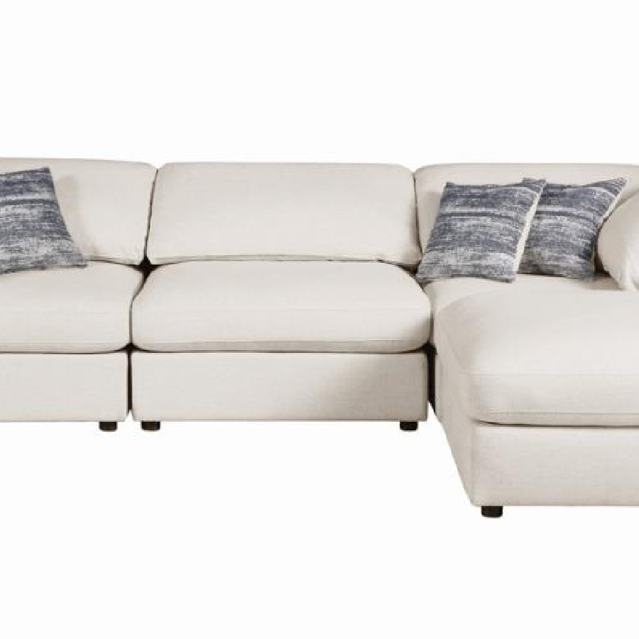 Create a welcoming seating area with this four-piece contemporary sectional. Designed with one armless chair, two corner chairs and one oversized ottoman, this modular sofa lends itself wonderfully to casual, chic entertainment spaces and family living rooms. Wrapped in a breathable linen-like fabric that is soft to the touch, this stylish sectional also features a neutral hue than offers a serene look to a restful retreat. jacquard accent pillows offer extra texture and dimension against the reversible back pillows. Slide the ottoman against a seat to transform the side into a chaise lounge to stretch out or rotate it in front to act as a coffee table for a drink tray.