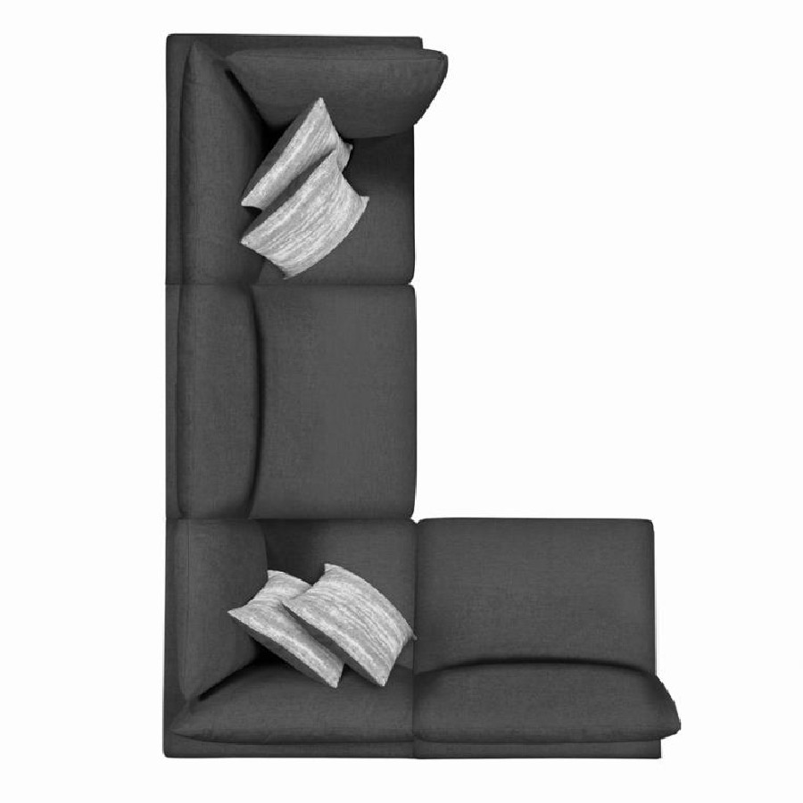 This contemporary four-piece sectional offers a versatile L-shape design that works with countless living room arrangements. Wrapped in a linen-like fabric, this modular sectional offers all the comfort one needs to kick back and relax. Reversible pillows and jacquard accent pillows beckon you to sink in for a midday nap or chat with guests. Petite black feet offer a subtle lift, defining the plush silhouette. Place this casual yet chic sectional in a family entertainment room for a restful retreat.