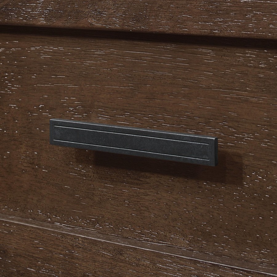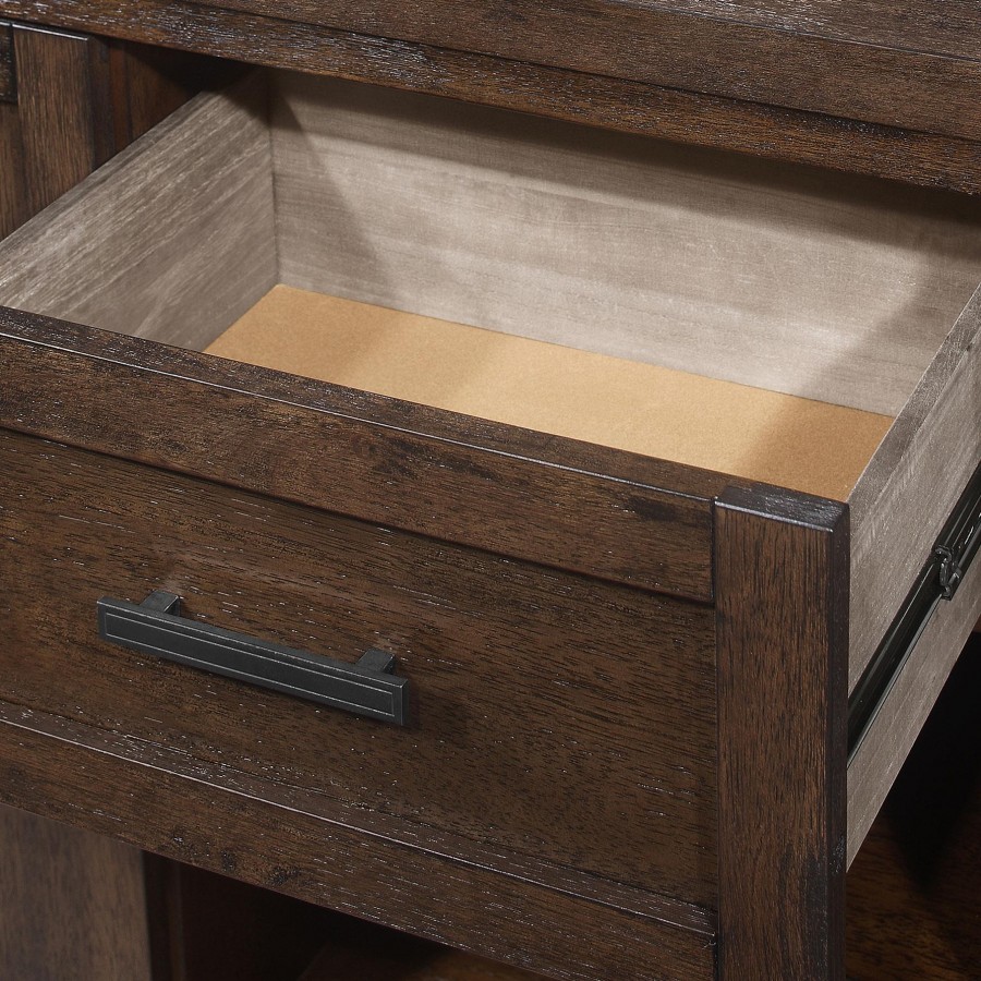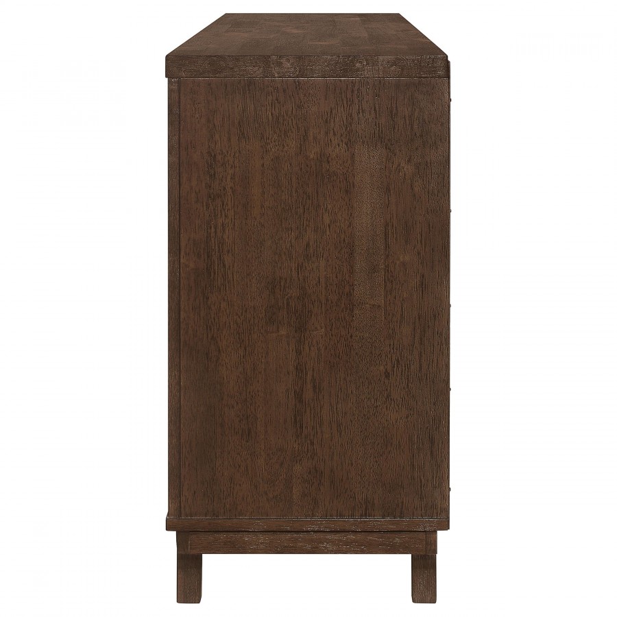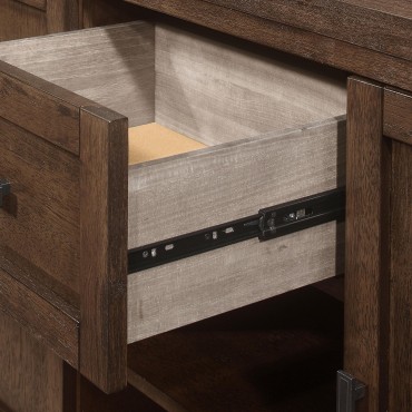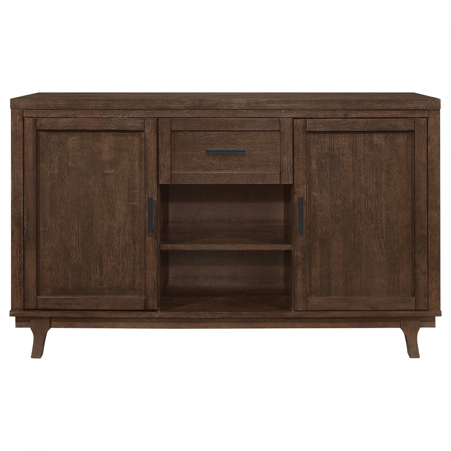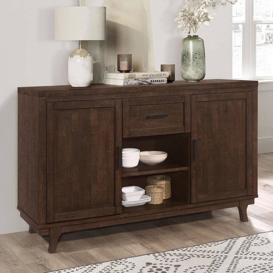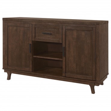 Enhance your dining area with our farmhouse and craftsman design dining server. Crafted from solid rubberwood, this server features a durable wire brushed brown oak finish, adding a rustic touch to your décor. It offers functionality with its two door cabinets, storage drawer, and two tiers of open shelving, providing ample space for organizing and displaying dining essentials.