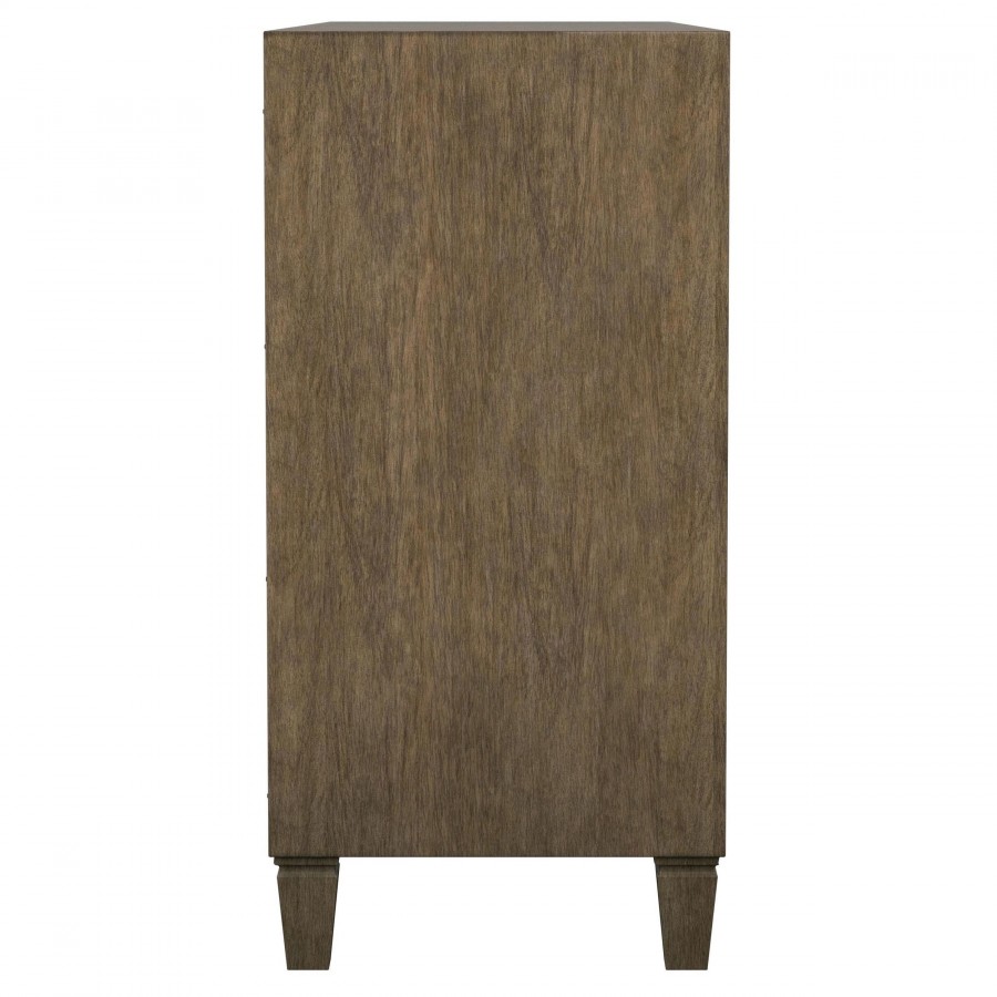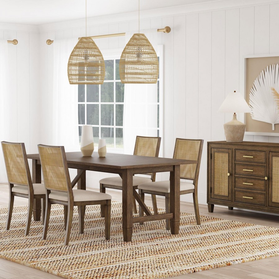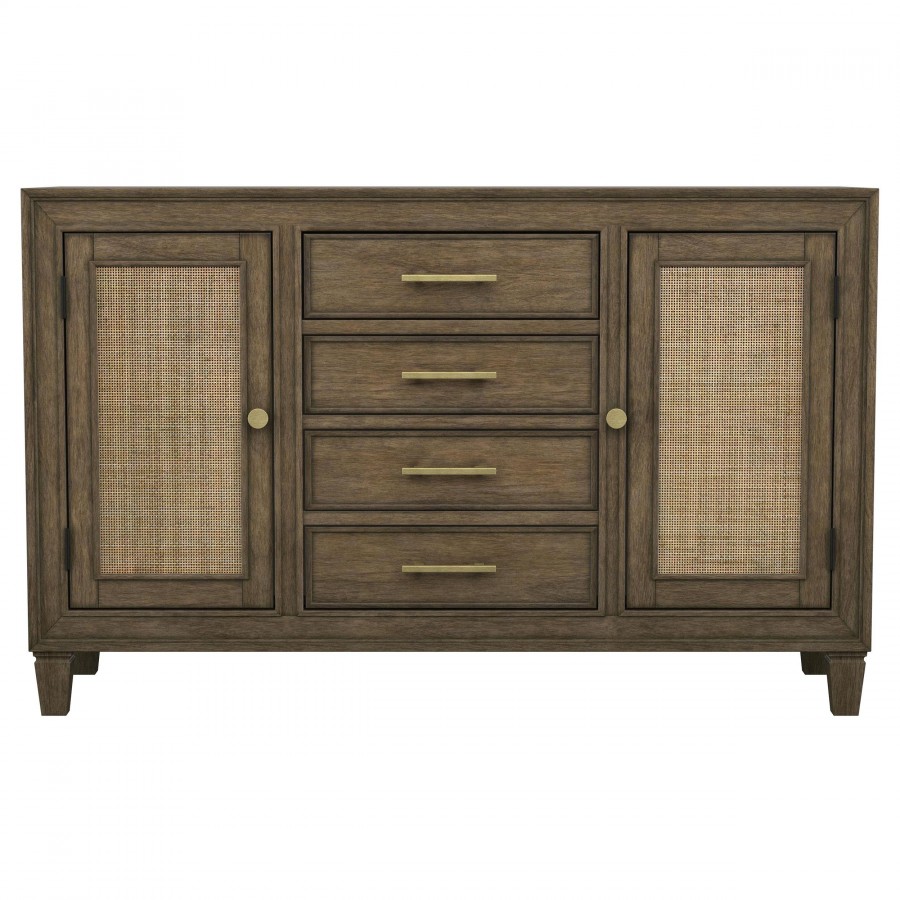 An impressive amount of storage pairs with impeccable style in a modern farmhouse sideboard. Simply charming in your dining room, it boasts a center core of four drawers, with two side cabinets that add a spot for larger items and serve ware. The sideboard is styled in a natural wood finish that's warm and inviting while each door features a lighter rattan panel, delivering airy ambiance and breezy character. Bar pulls in a warm metallic hue highlight the drawers, while doors feature matching round knobs. Serve delicious buffets on the tabletop, or choose an assortment of decor that adds a personalized touch.