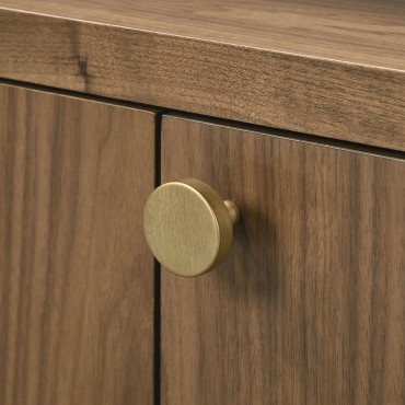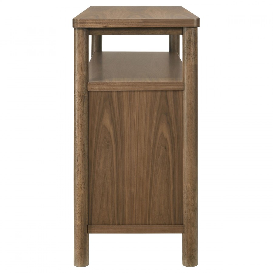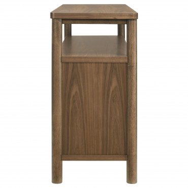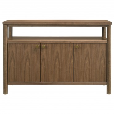 Add easy style and ample storage to your dining room with a modern wooden sideboard with three doors. An open shelf adds easy display space beneath the tabletop, perfect for seasonal accessories that enhance a personalized look and feel. The sideboard features a walnut finish that highlights the wood grain details of its surfaces. Round post legs add a hint of movement to the piece, while three doors open to reveal adjustable shelves for easy storage and organization. Its wide top is ideal for serving delicious meals or showcasing decor.