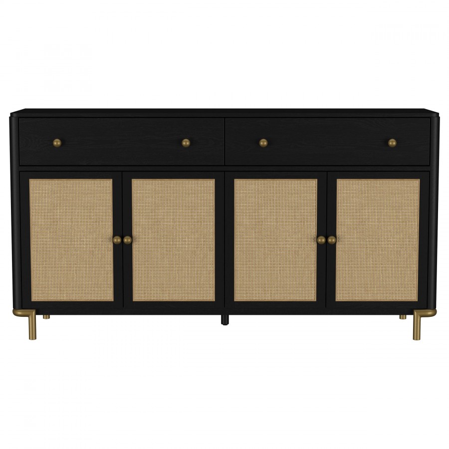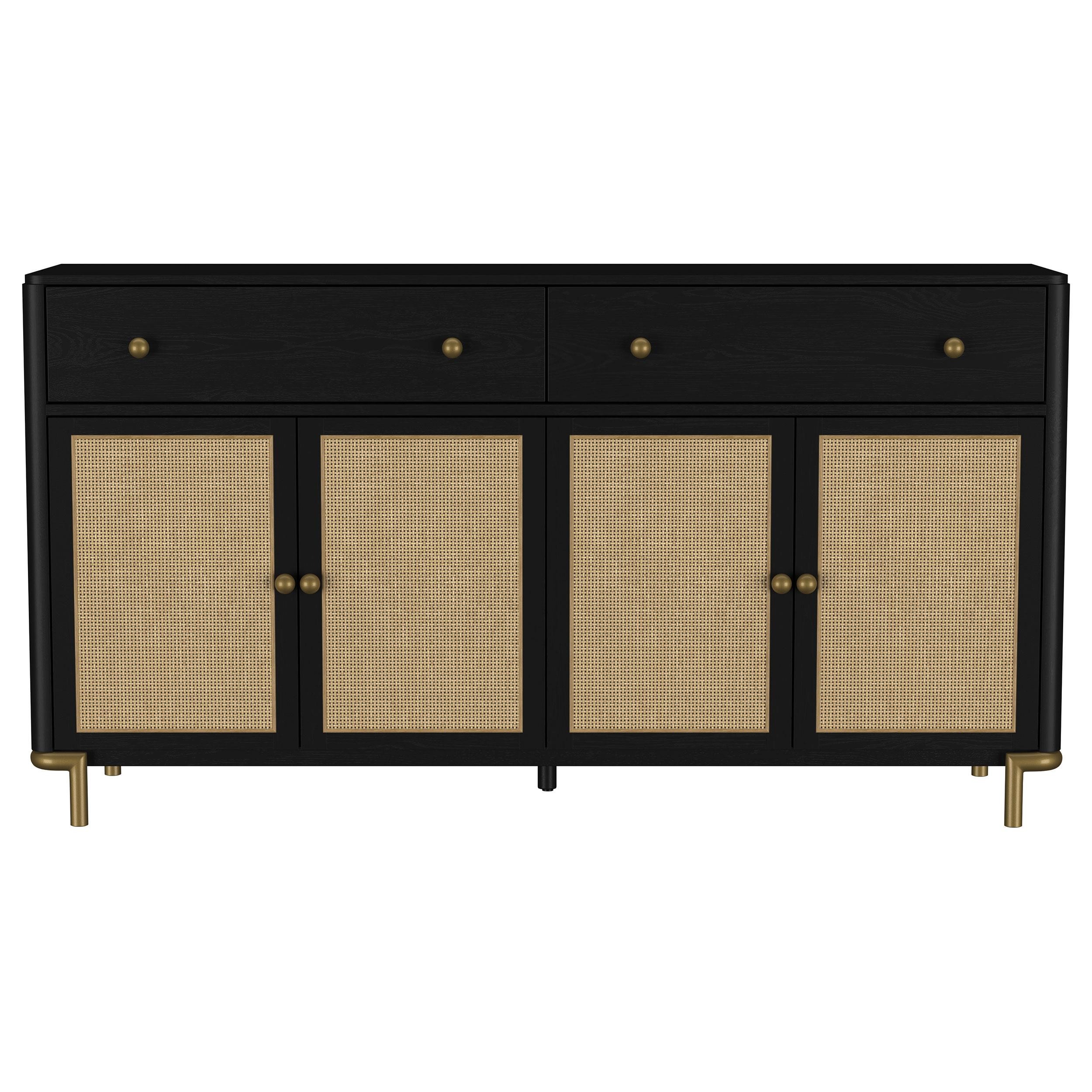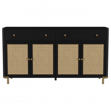 This 65-inch sideboard combines modern sophistication with organic charm and exceptional functionality. Featuring handcrafted woven cane door panels from Indonesia, it adds natural texture to any space. Constructed from solid rubberwood and white ash veneer, its refined craftsmanship is enhanced by a 17-step finishing process. Felt-lined drawers with English dovetail construction glide smoothly on 45mm metal ball-bearing tracks, while soft-close Euro-hinged doors and adjustable shelves offer practical storage. Antique brass knobs and legs complete the elegant design.