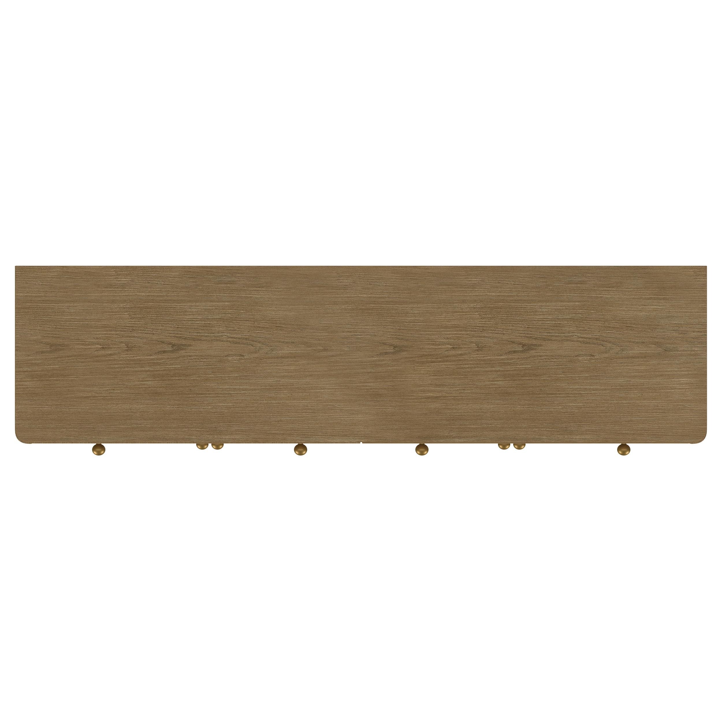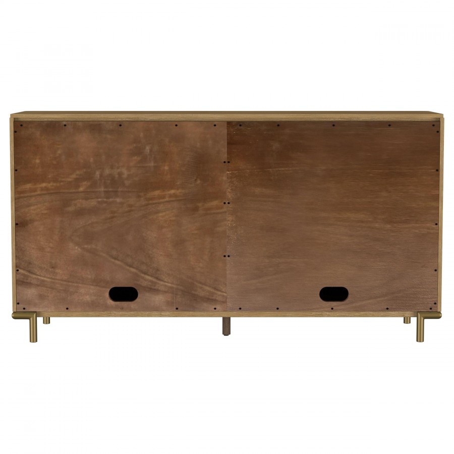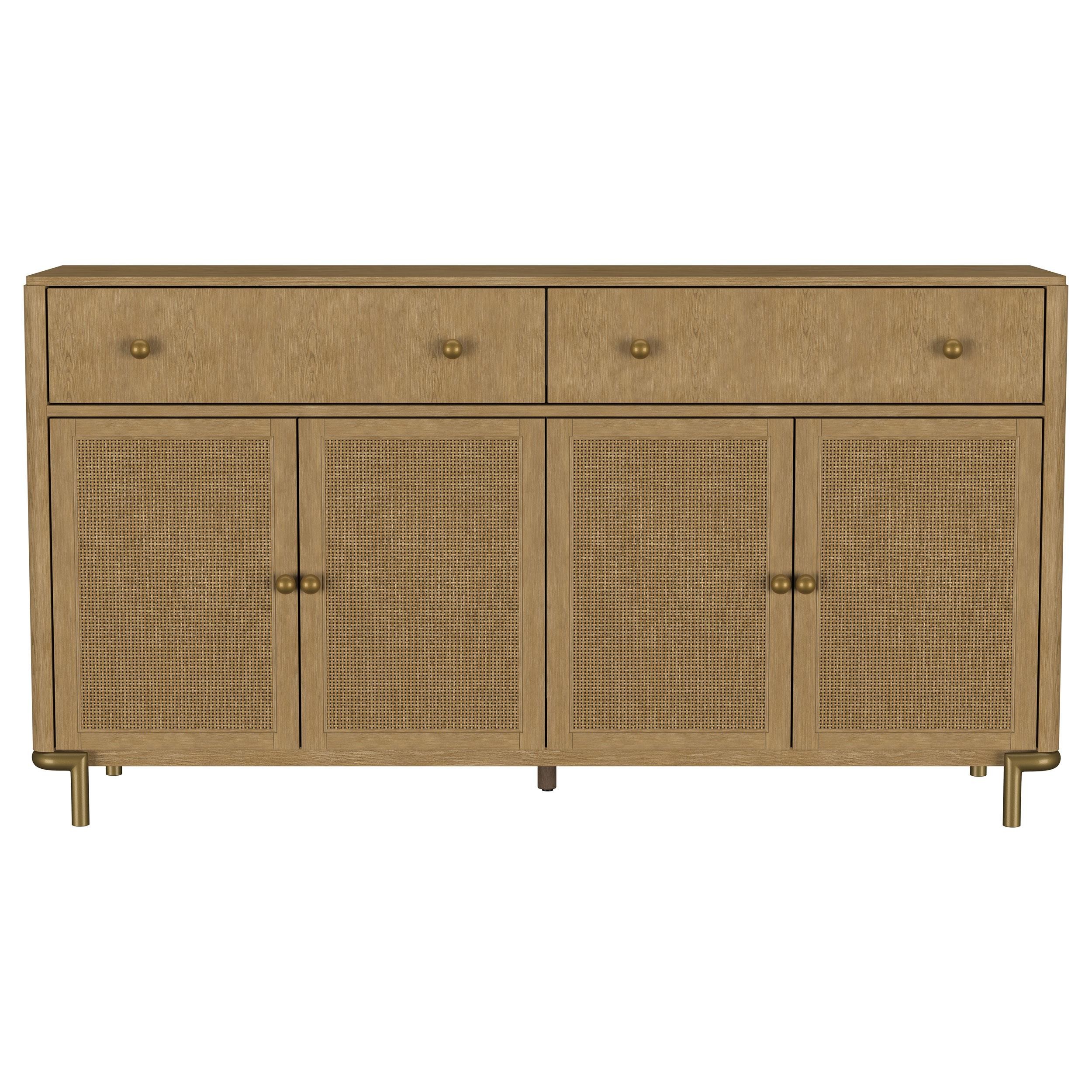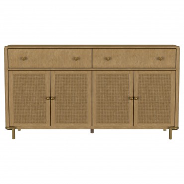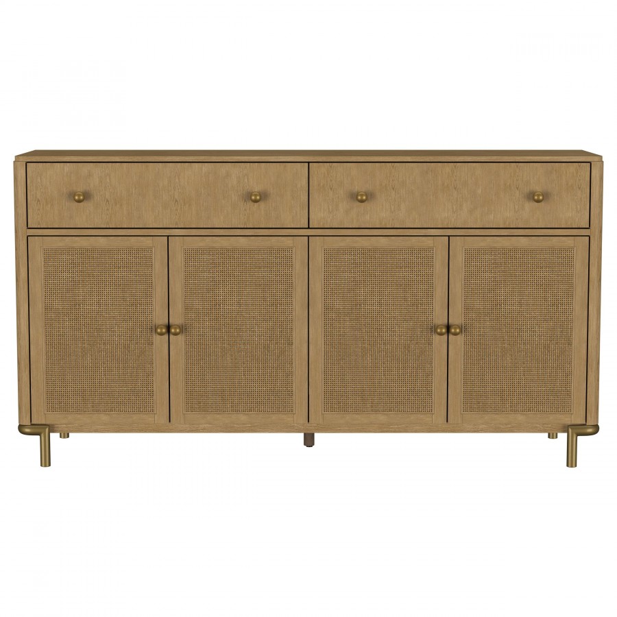 This 65-inch sideboard combines modern sophistication with organic charm and exceptional functionality. Featuring handcrafted woven cane door panels from Indonesia, it adds natural texture to any space. Constructed from solid rubberwood and white ash veneer, its refined craftsmanship is enhanced by a 17-step finishing process. Felt-lined drawers with English dovetail construction glide smoothly on 45mm metal ball-bearing tracks, while soft-close Euro-hinged doors and adjustable shelves offer practical storage. Antique brass knobs and legs complete the elegant design.