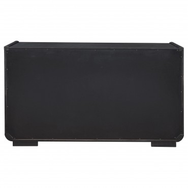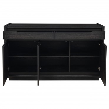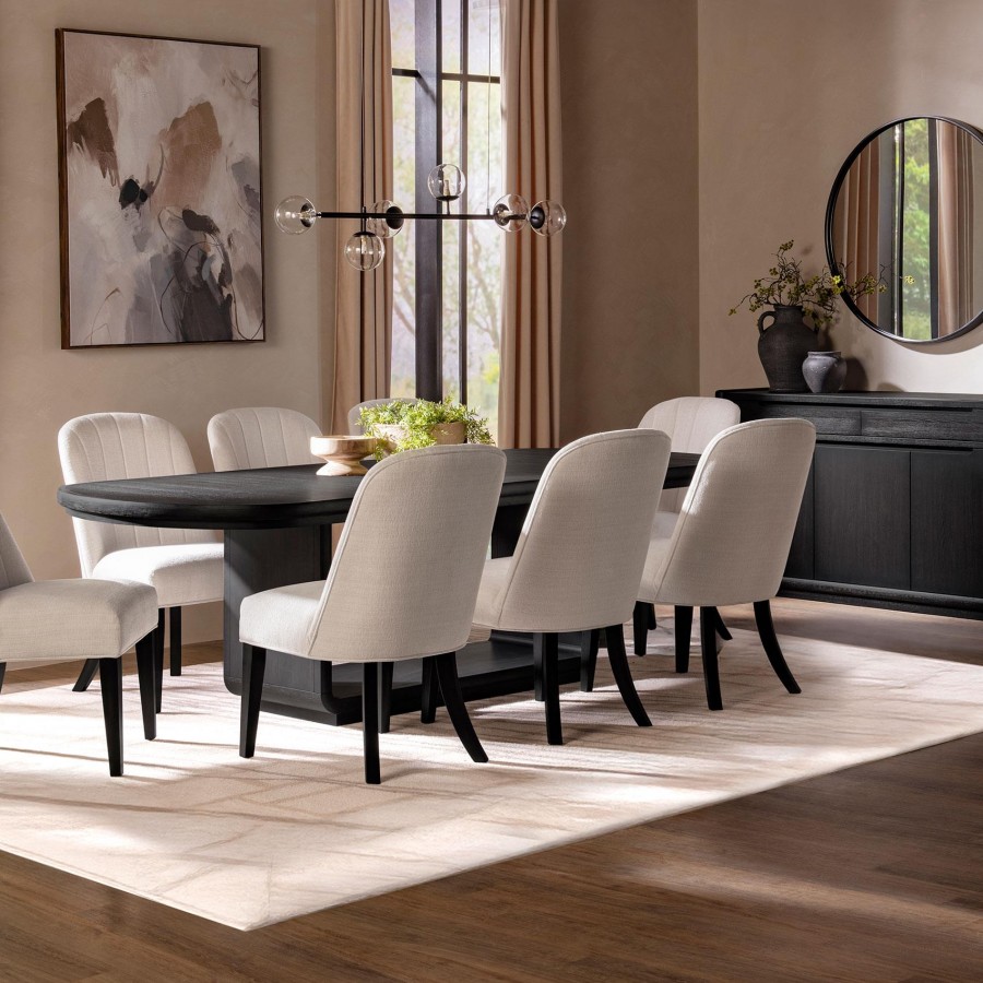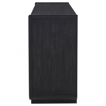 With a presence both grounded and graceful, this sideboard offers quiet beauty and purposeful design. Draped in a burnished black finish, its soft curves and minimalist lines open to thoughtful storage, two felt-lined drawers for treasured linens and flatware, and three softly closing doors revealing fixed shelves behind. Each detail, from the whisper-quiet glides to the dust panel below, is a study in balance, offering elegance that lingers long after the meal is done.